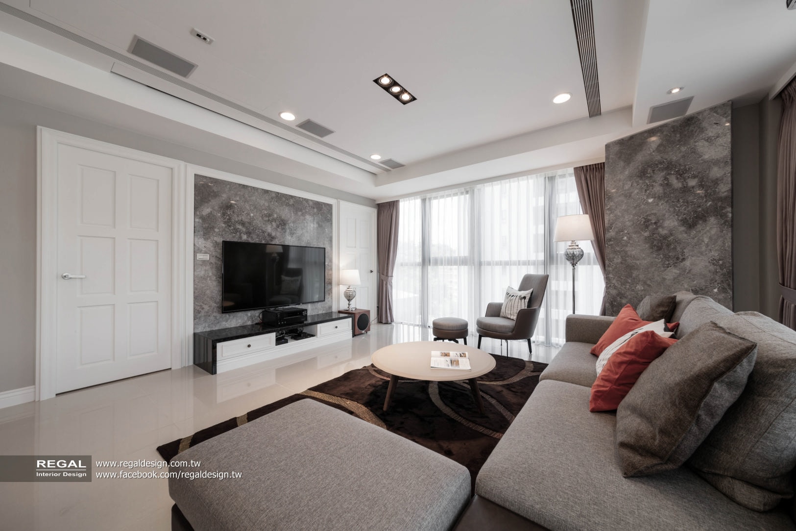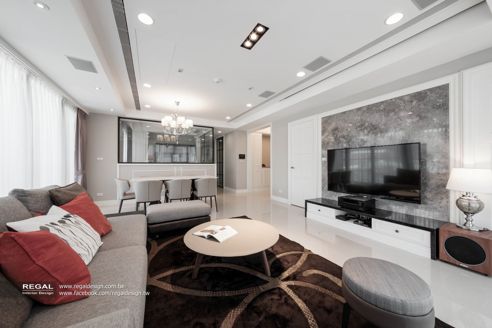 3.電視牆面牆店古典美學的對稱軸線,主牆以雲墨大理石鋪陳,電視牆兩旁則以白色典雅門扉相互對稱,左邊是主臥室入口,右邊則是裝飾門。