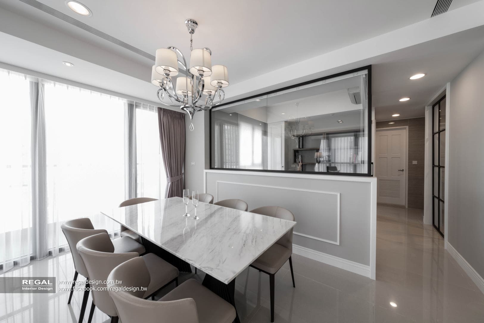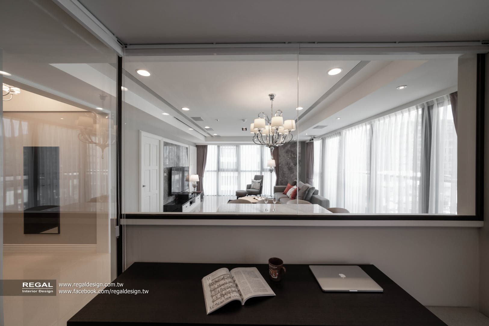 4.位於客餐桌區旁的工作書房改為半通透的區塊,以穿透性高的強化清玻璃與優雅的半腰線板作為隔間牆,視覺穿透公共空間不影響開闊感。
