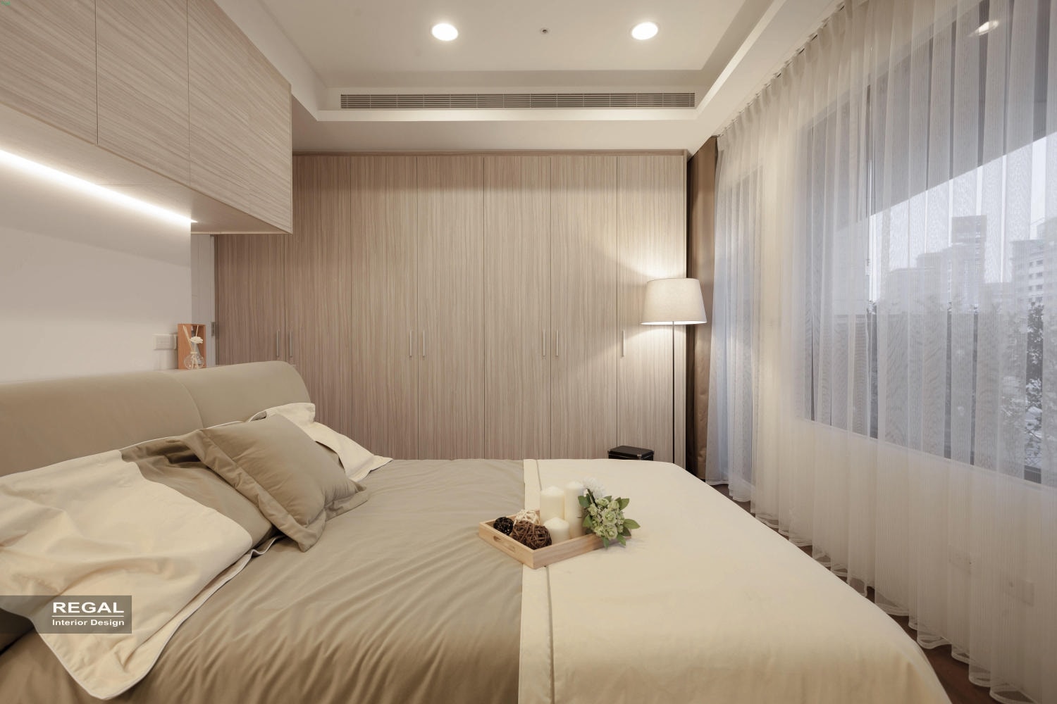 臥房以淺色木質搭配柔和窗紗,將空間營造出放鬆、舒適的睡眠氛圍。