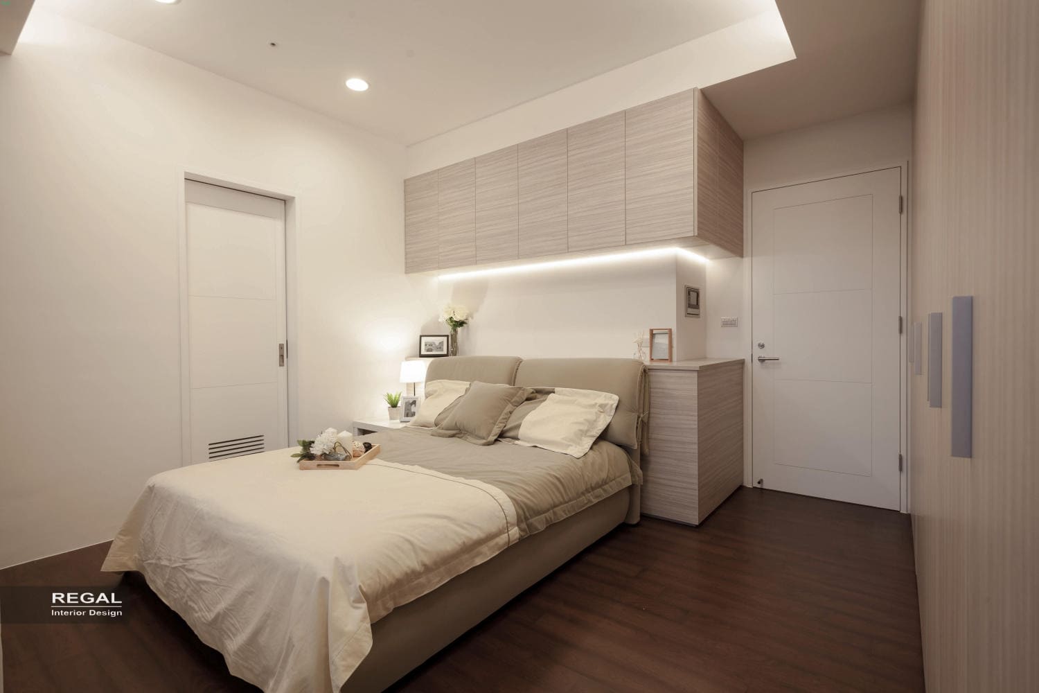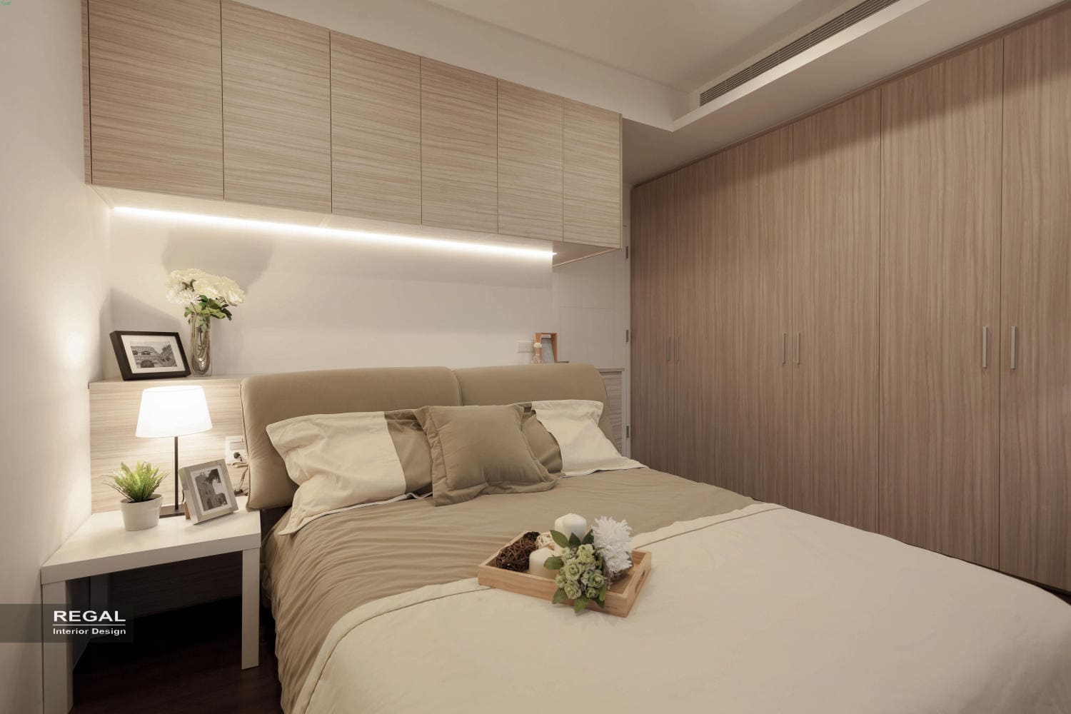 4.挪開主臥房的開門位置,讓主臥衣櫥得以延伸整片牆提高收納空間。床頭吊櫃與下跪包覆的核心其實為女孩房的衣櫥,靈活設計為主臥與女孩房爭取最高的收納效益。