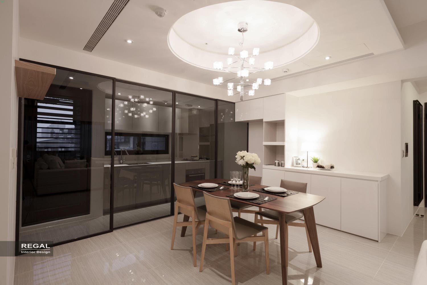 3.餐廳與廚房之間採用半穿性強化灰玻璃拉門,保有穿透與區隔餐廳/廚房之間的高度彈性,也能避免油煙味飄散至廚房外。