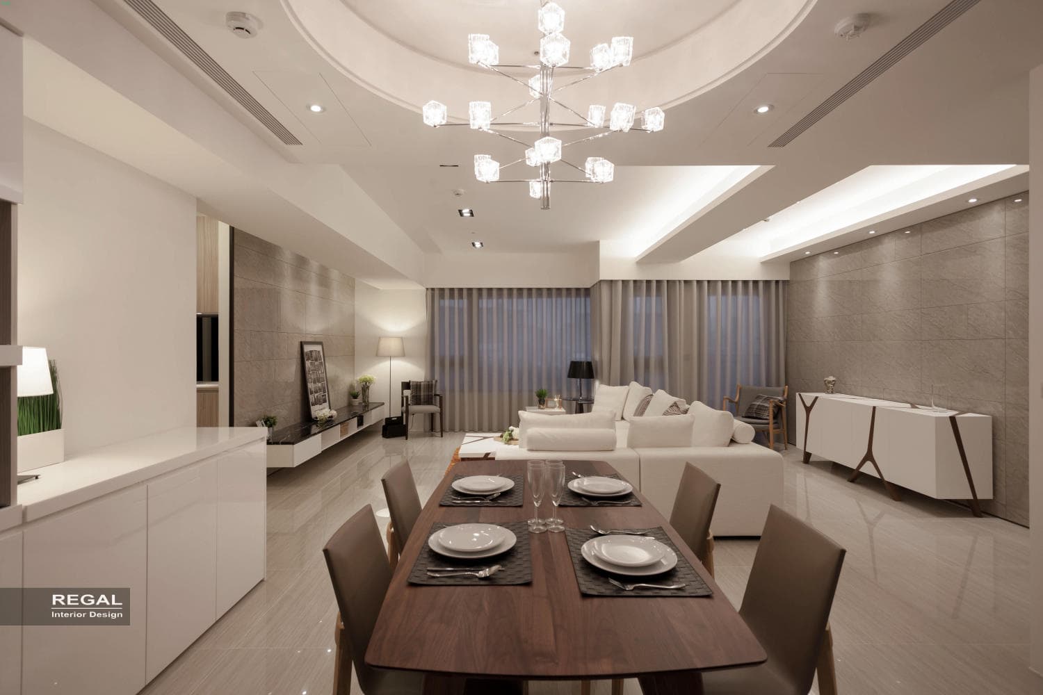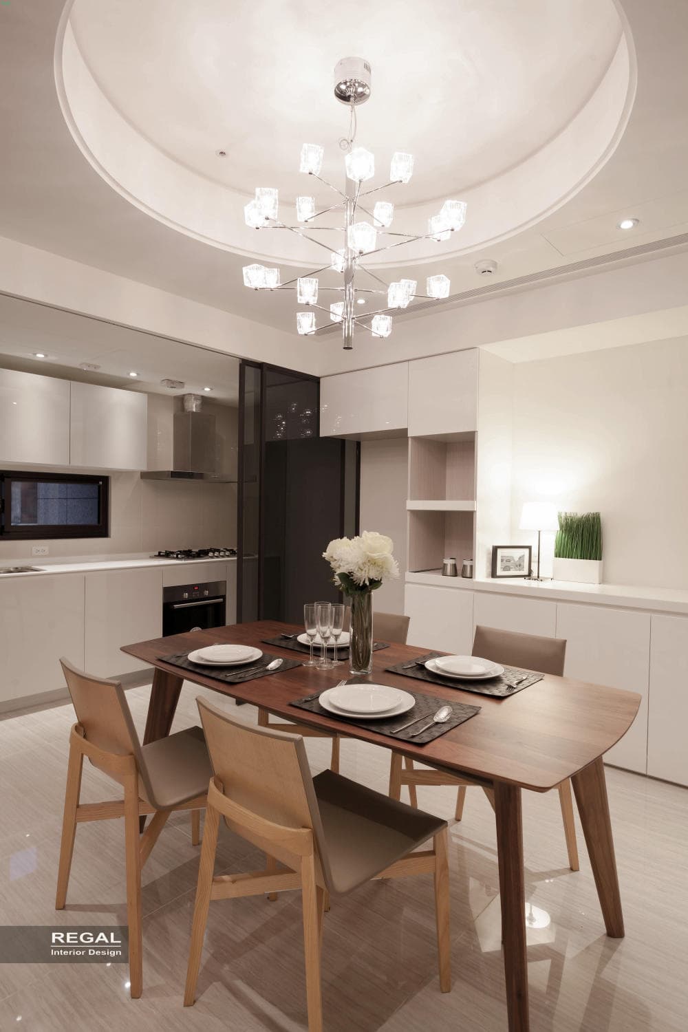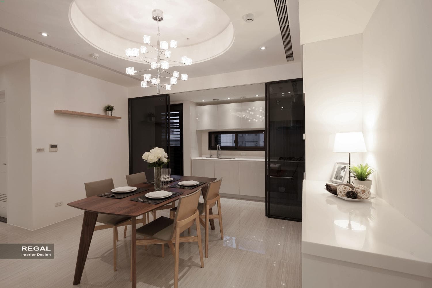 餐廳以幾何造型搭配散冰狀吊燈,營造時尚的敘餐情境。搭配白色的電器餐櫃,運用了收納機能設計修飾原本的梁柱。