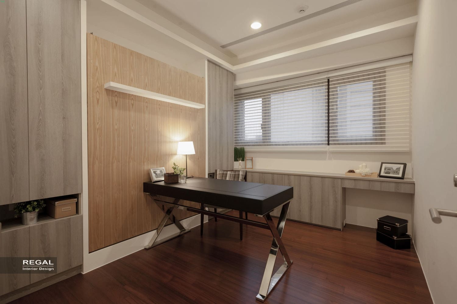 6.偶爾返台居住的男孩房,改以活動式下掀床的方式,平日則做為書房用途,讓房間不閒置還能因應需求做彈性變化。對稱的兩排造型櫃凹槽也經由精算後的高度打造,以符合床板平鋪石的隨手置物機能。
