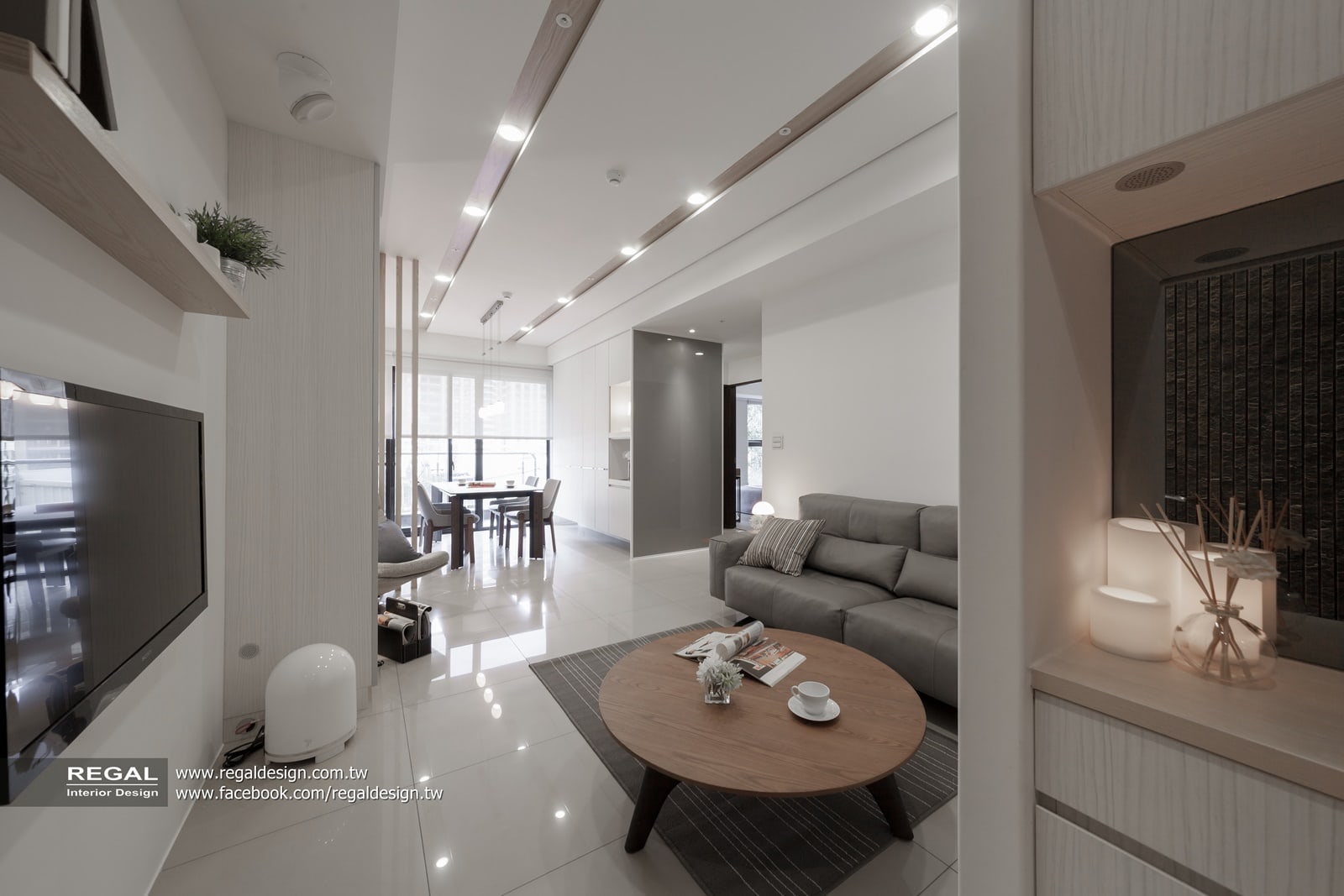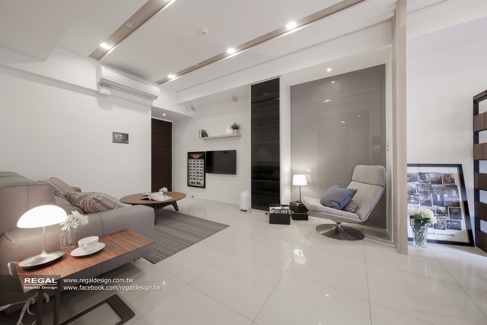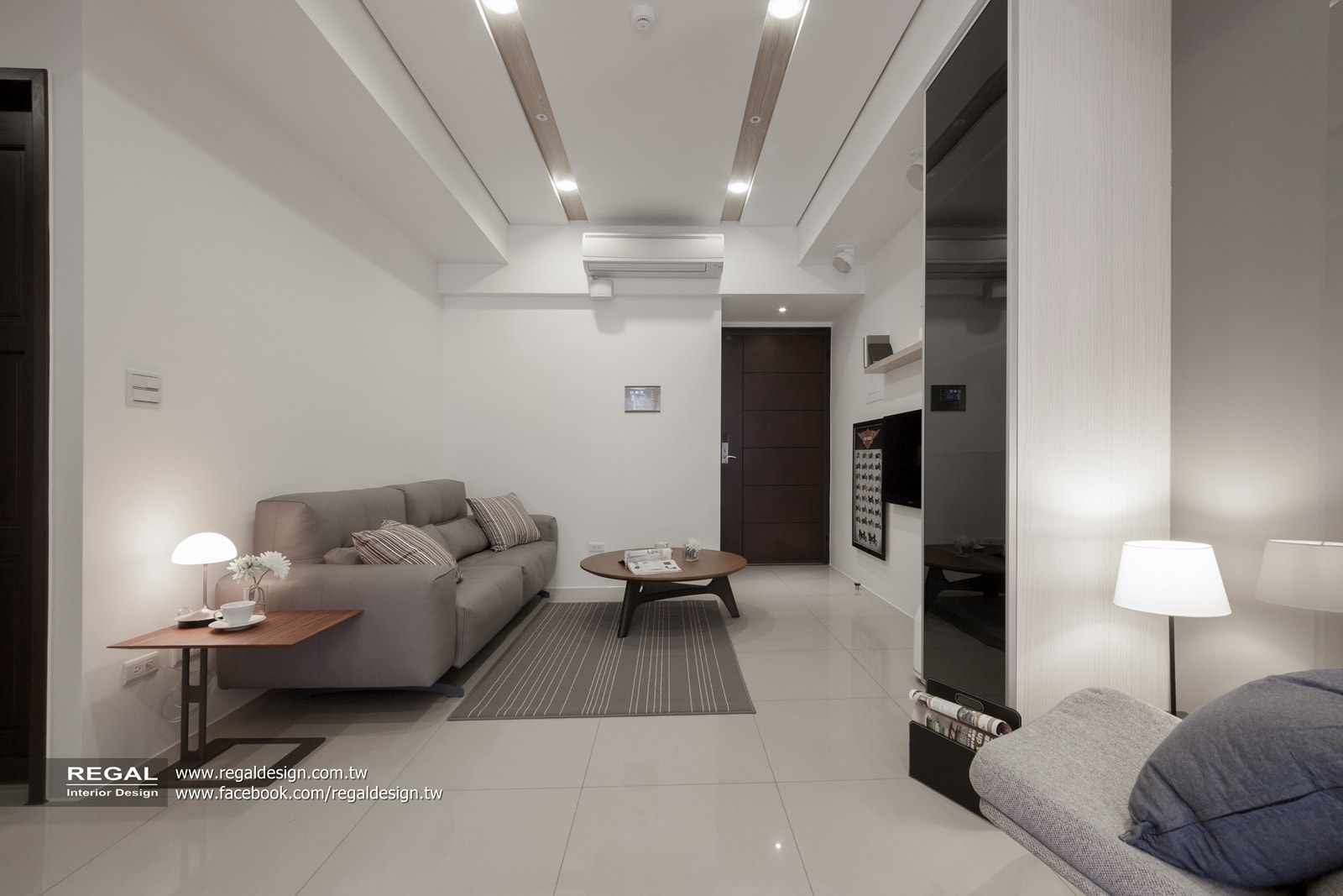 建材使用:天然木皮、烤漆鐵件、烤漆玻璃、耐磨木地板、灰鏡
