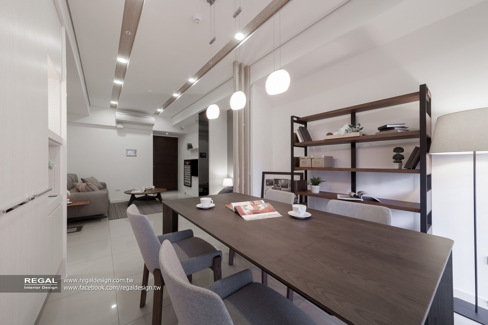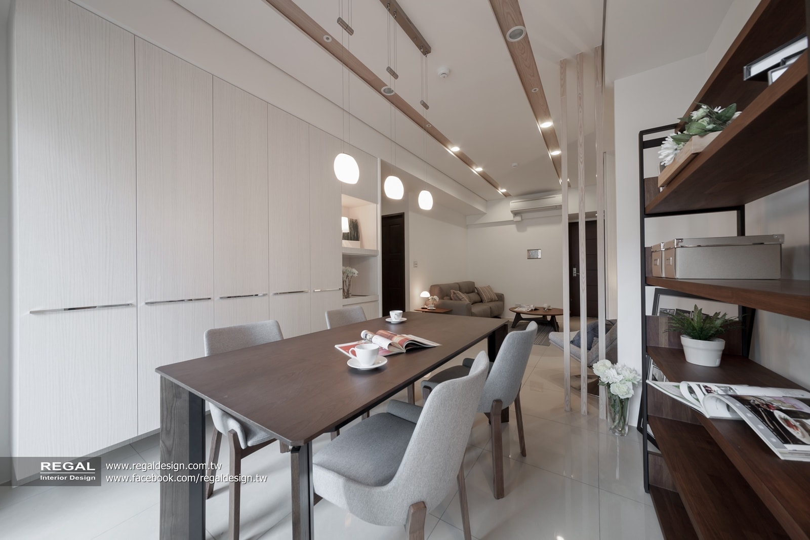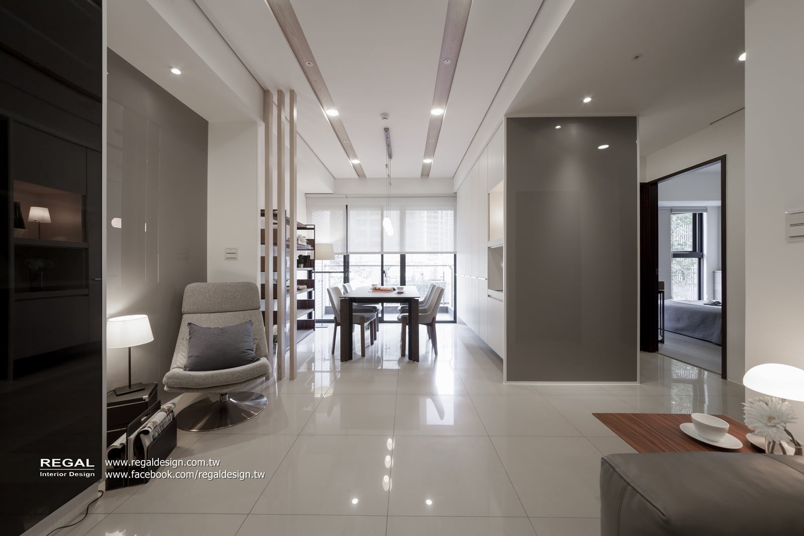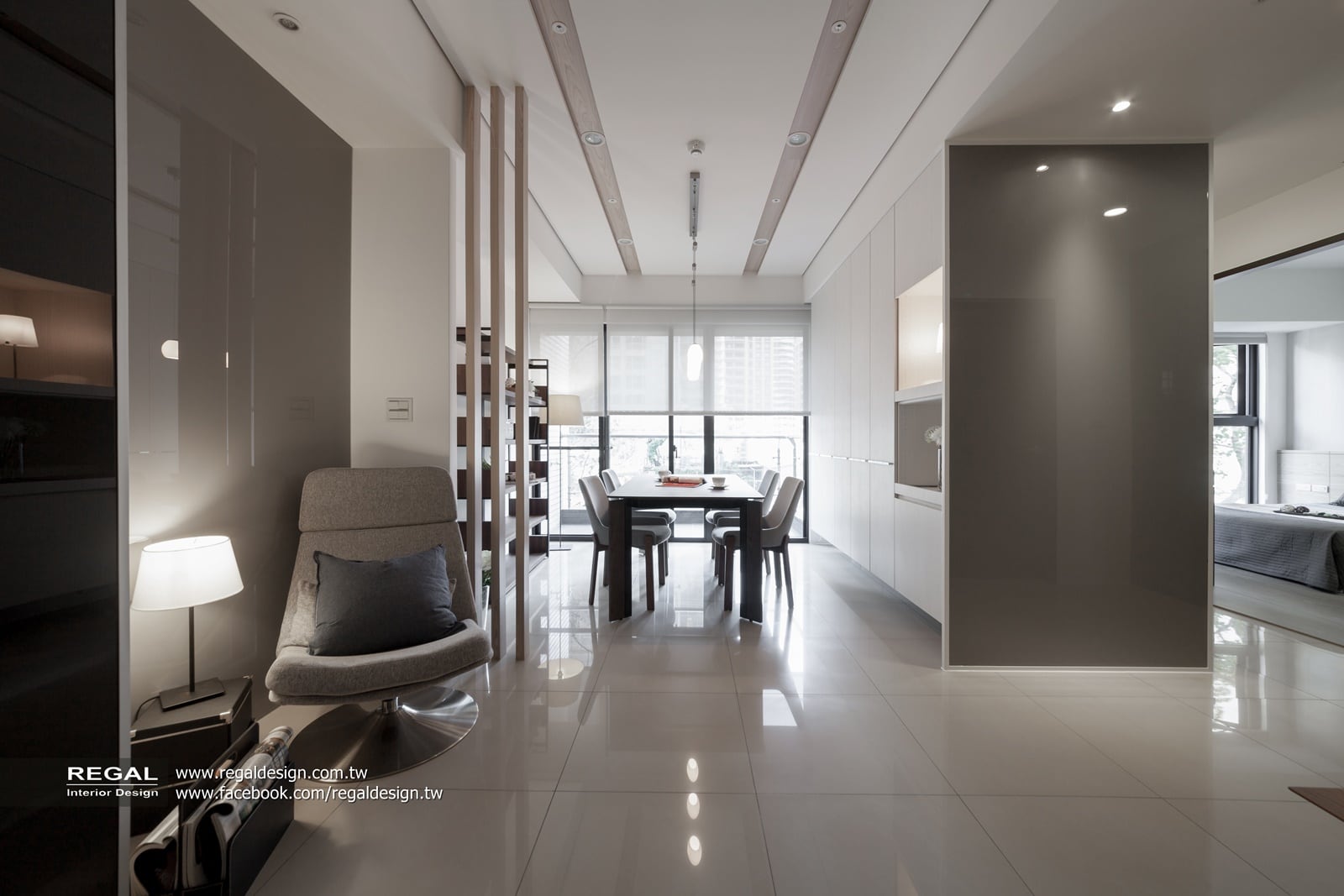 建材使用:天然木皮、烤漆鐵件、烤漆玻璃、耐磨木地板、灰鏡