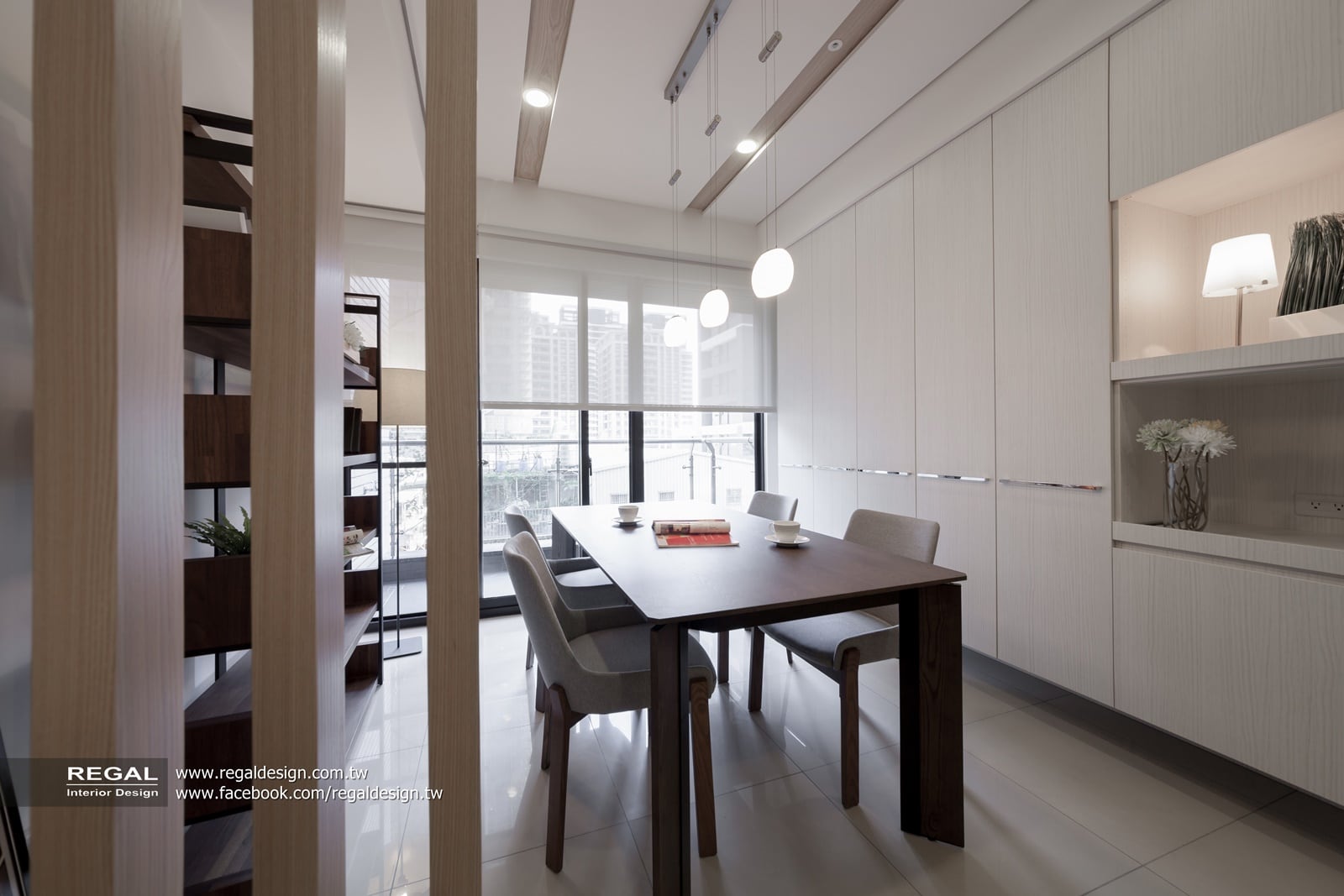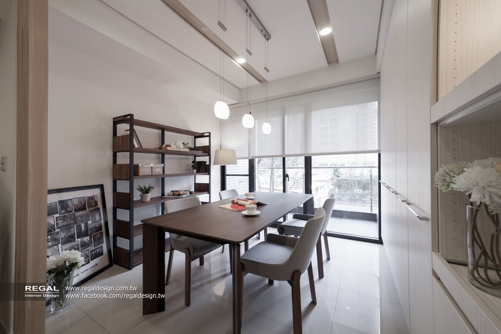▲採光良好的餐廳與書房結合,靠牆設置造型書櫃,能夠隨著使用需求靈活更變為用餐空間或是閱讀書房,另一側則整合電器與收納櫃牆面。