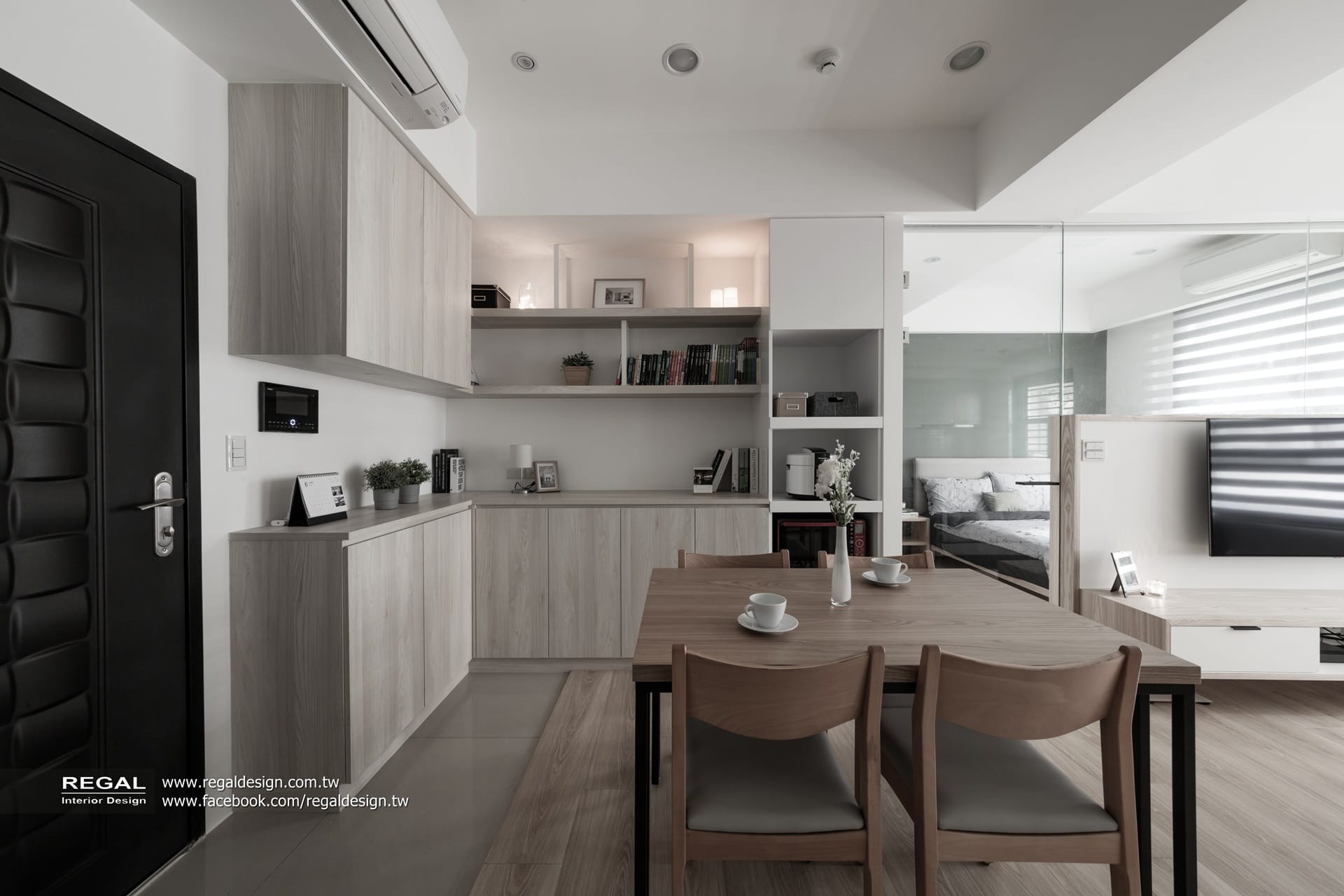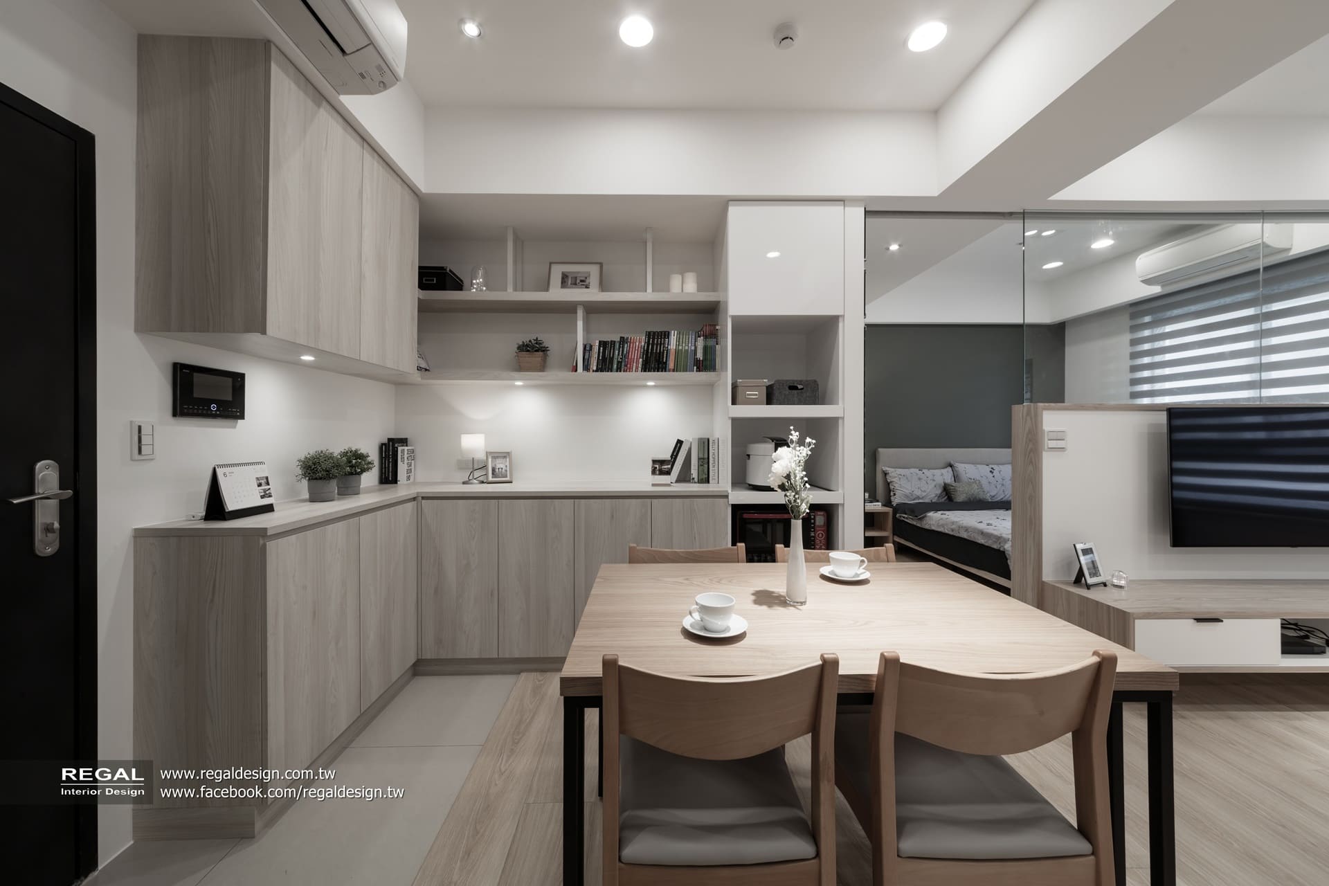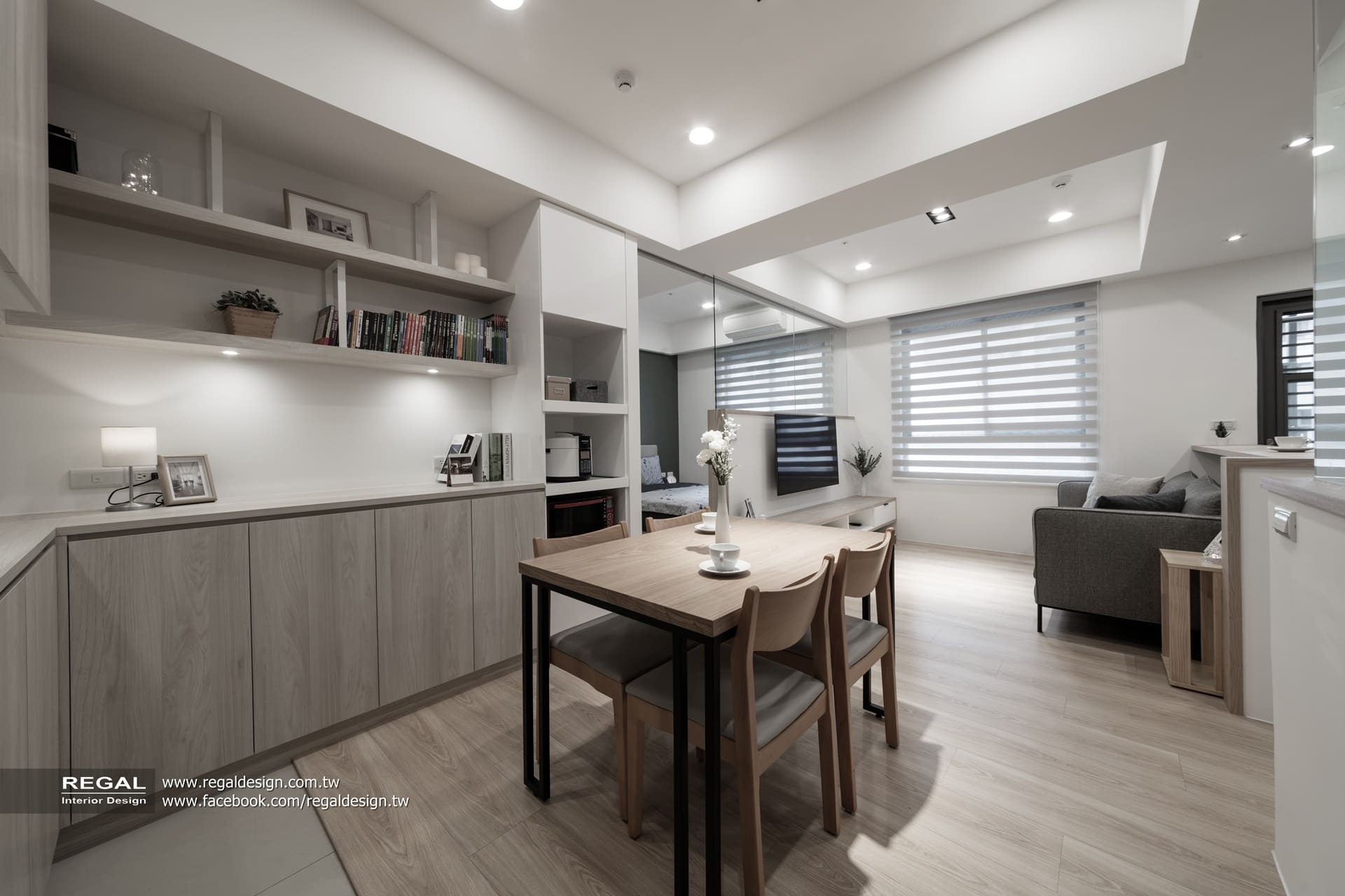 6.小坪數首要重視收納規劃,考量屋主的閱讀習慣,將閱讀書桌結合用餐區,以複合式設計增設書牆機能,提供屋主收藏日常書籍;在主臥室規劃一區更衣空間,並將收納機能集中整合,使小空間也擁有符合需求的收納機能。