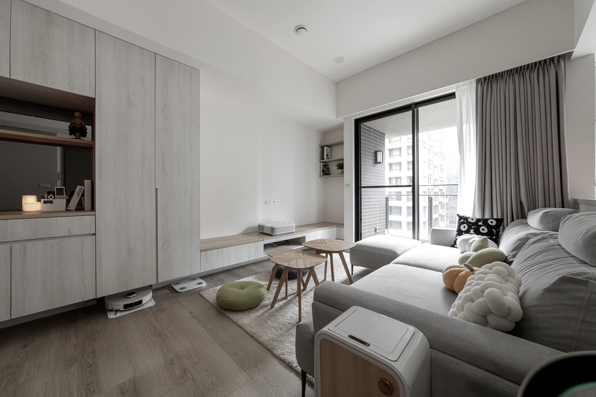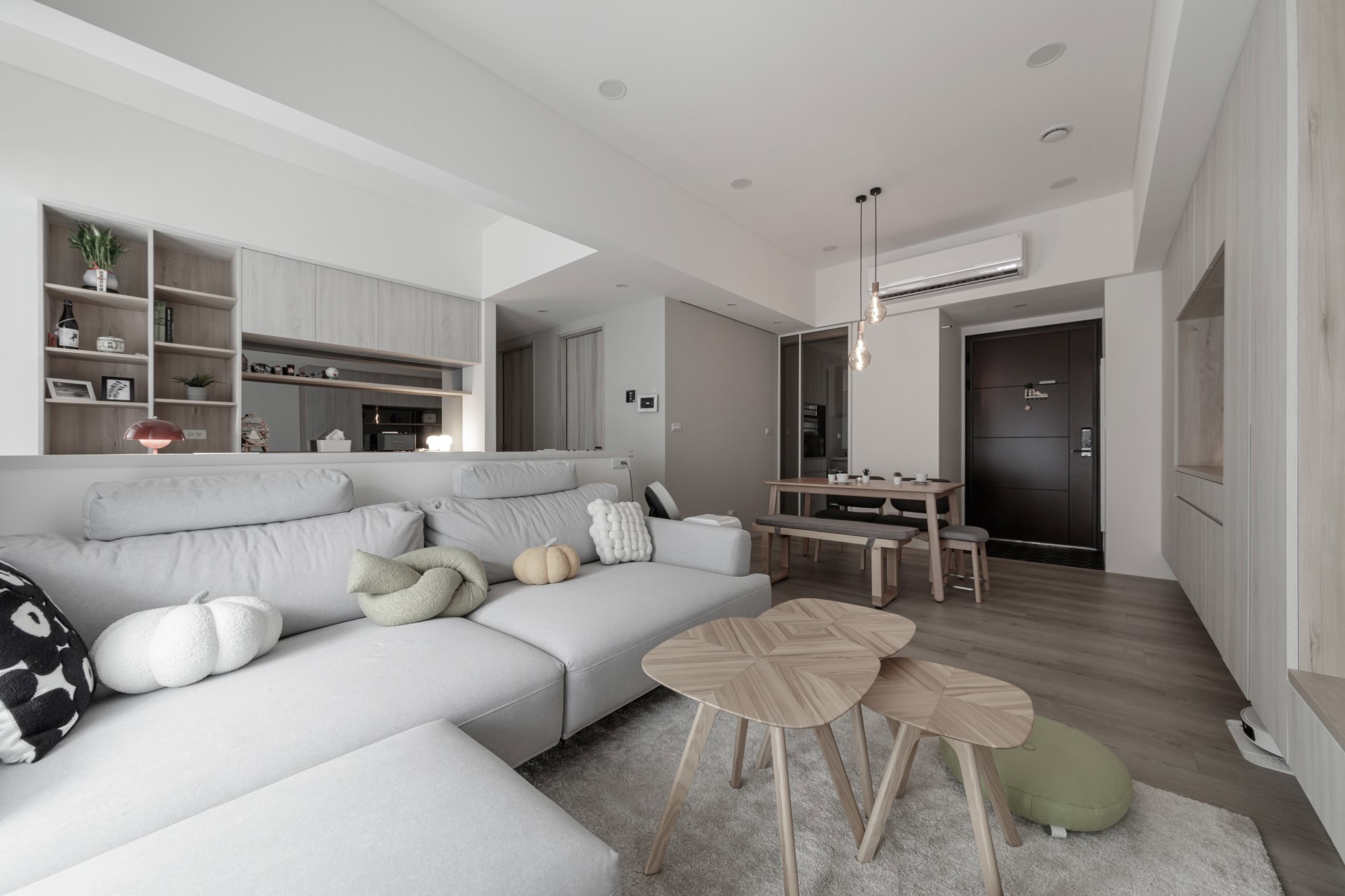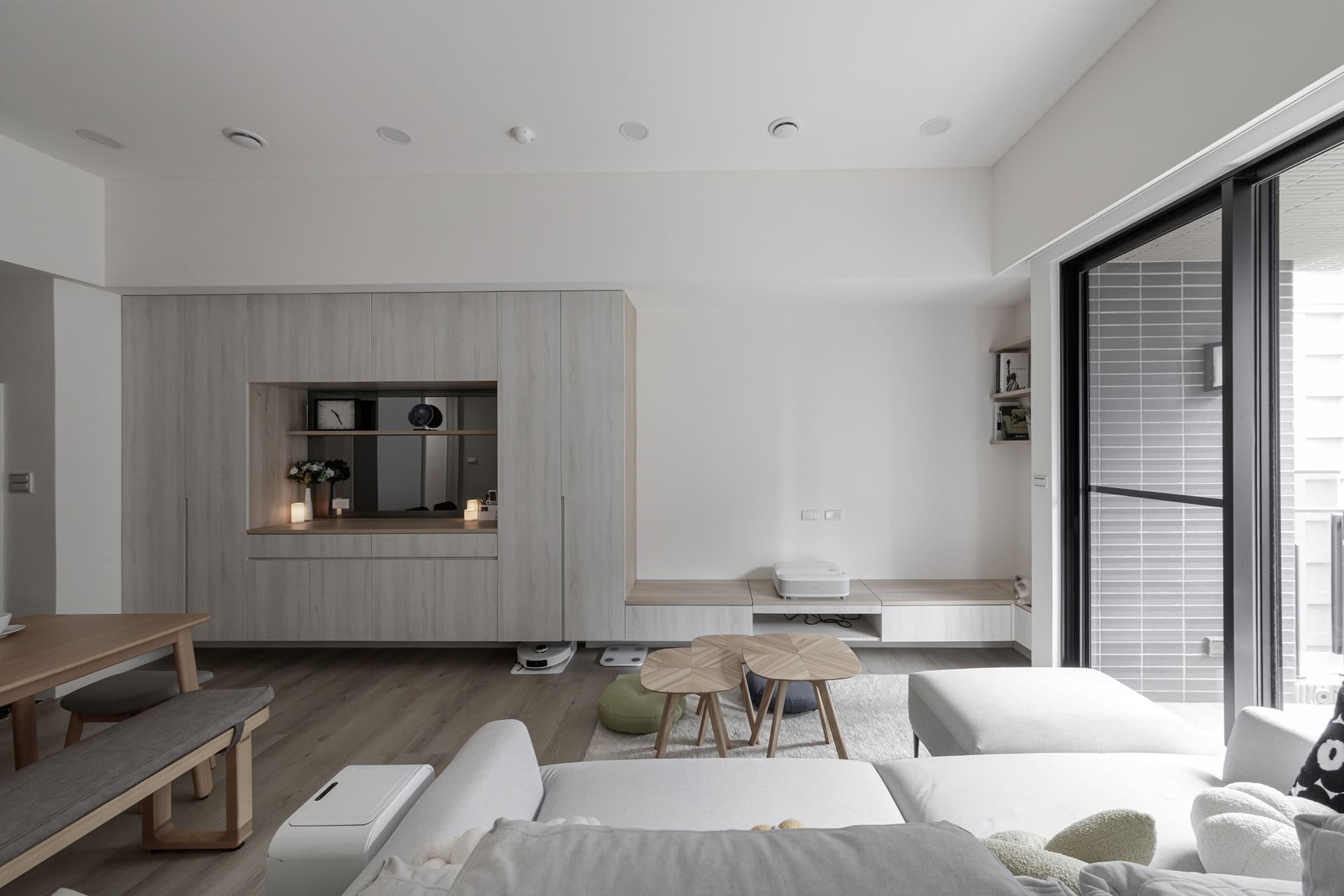 ▲ 面對 20 坪的挑戰,我們將收納視為一場美學計畫。從玄關延伸至餐飲區的櫃體採大面整合設計,巧妙利用矮櫃下方擴展機器人收納空間。