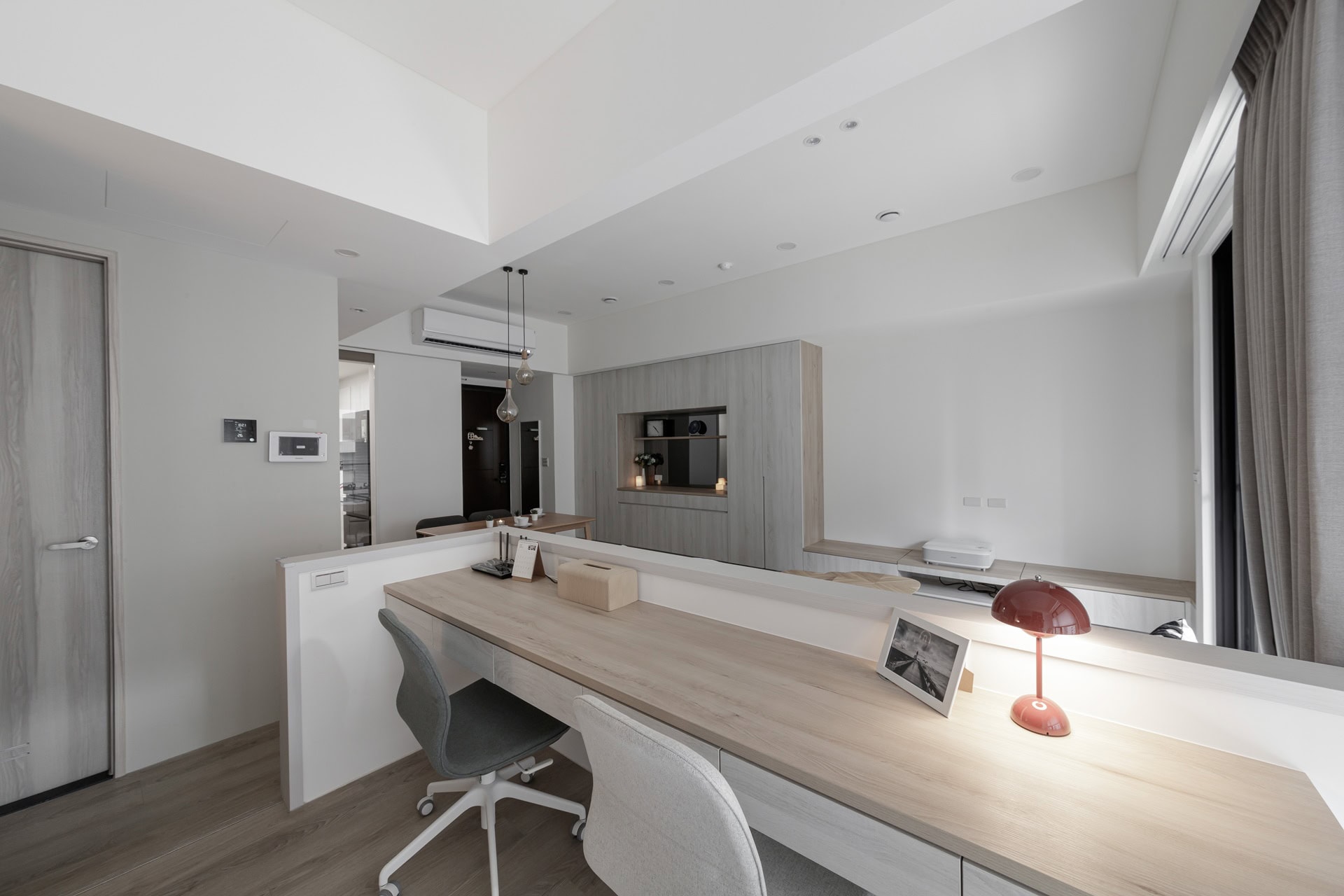 ▲ 在簡練的北歐結構中,置入了高感度的影音需求。電視牆搭配雷射電視設備,讓客廳隨時能切換為家庭劇院模式。每一處細節皆回應著居住者對生活質感的堅持。