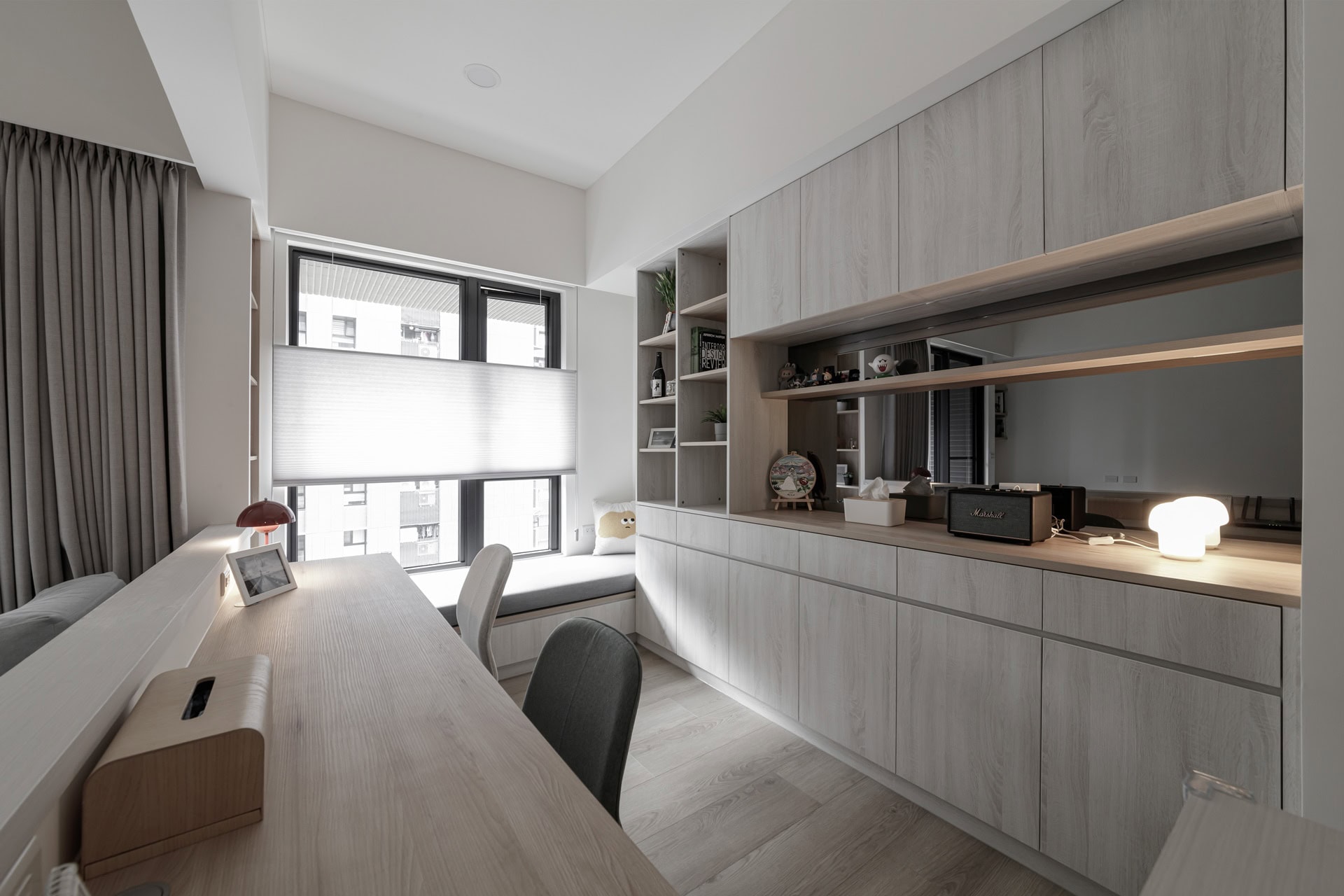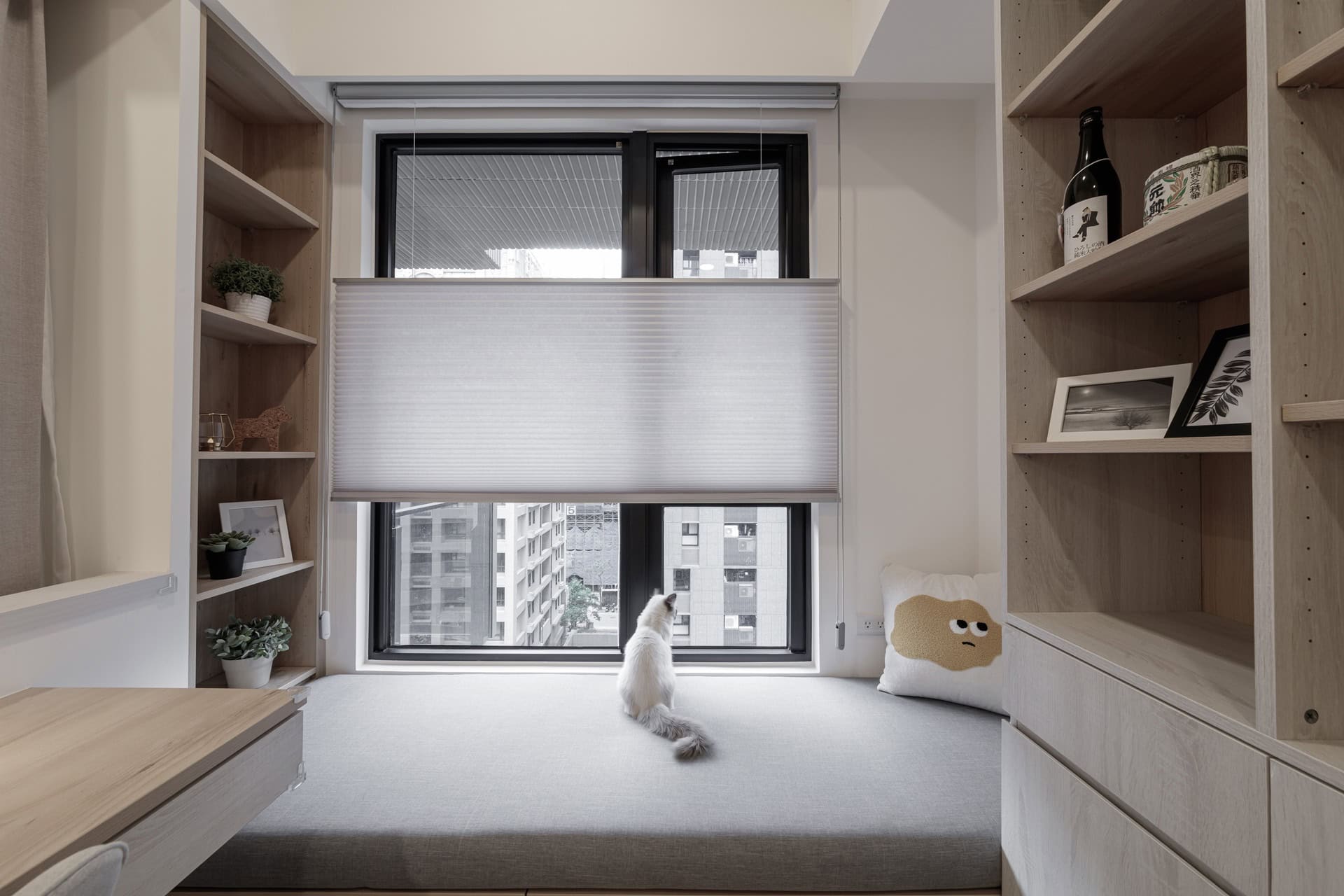 ▲ 在窗邊設計整合機能的日光和室感臥榻,搭配靈活調光的風琴簾,成為屋主閱讀與貓咪午後休憩的最佳場域。整體色調以中性灰白與暖心木質為核心,藉由留白語彙讓視覺壓力消失殆盡,營造純粹的舒壓美學。