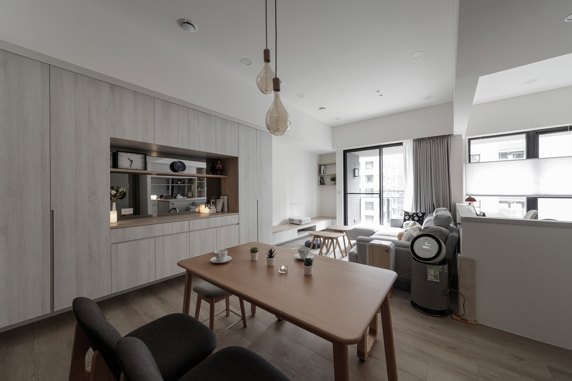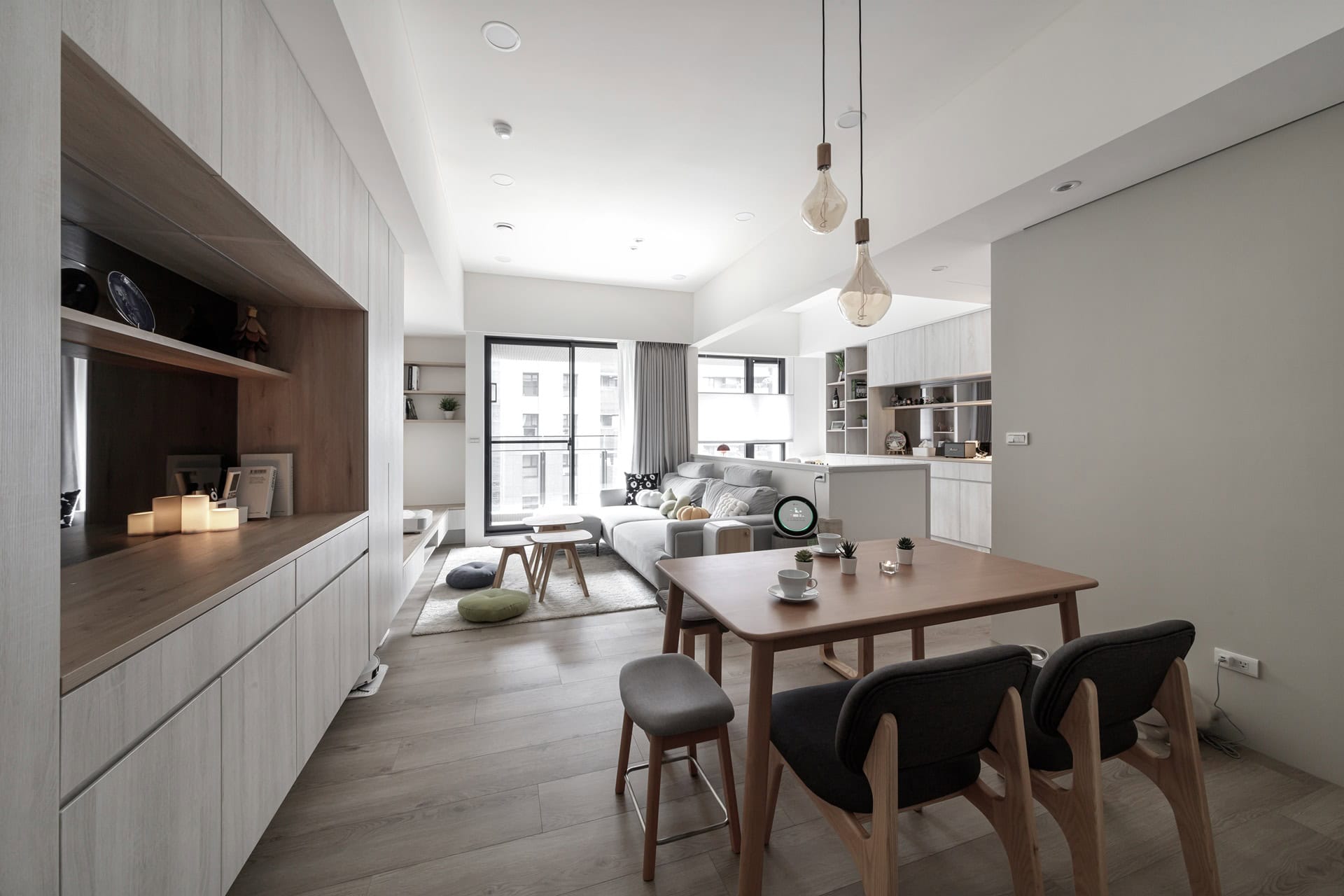 開放式格局搭配大面落地窗與中性色家具,引入充沛自然光,形塑明亮柔和的空間氣氛。