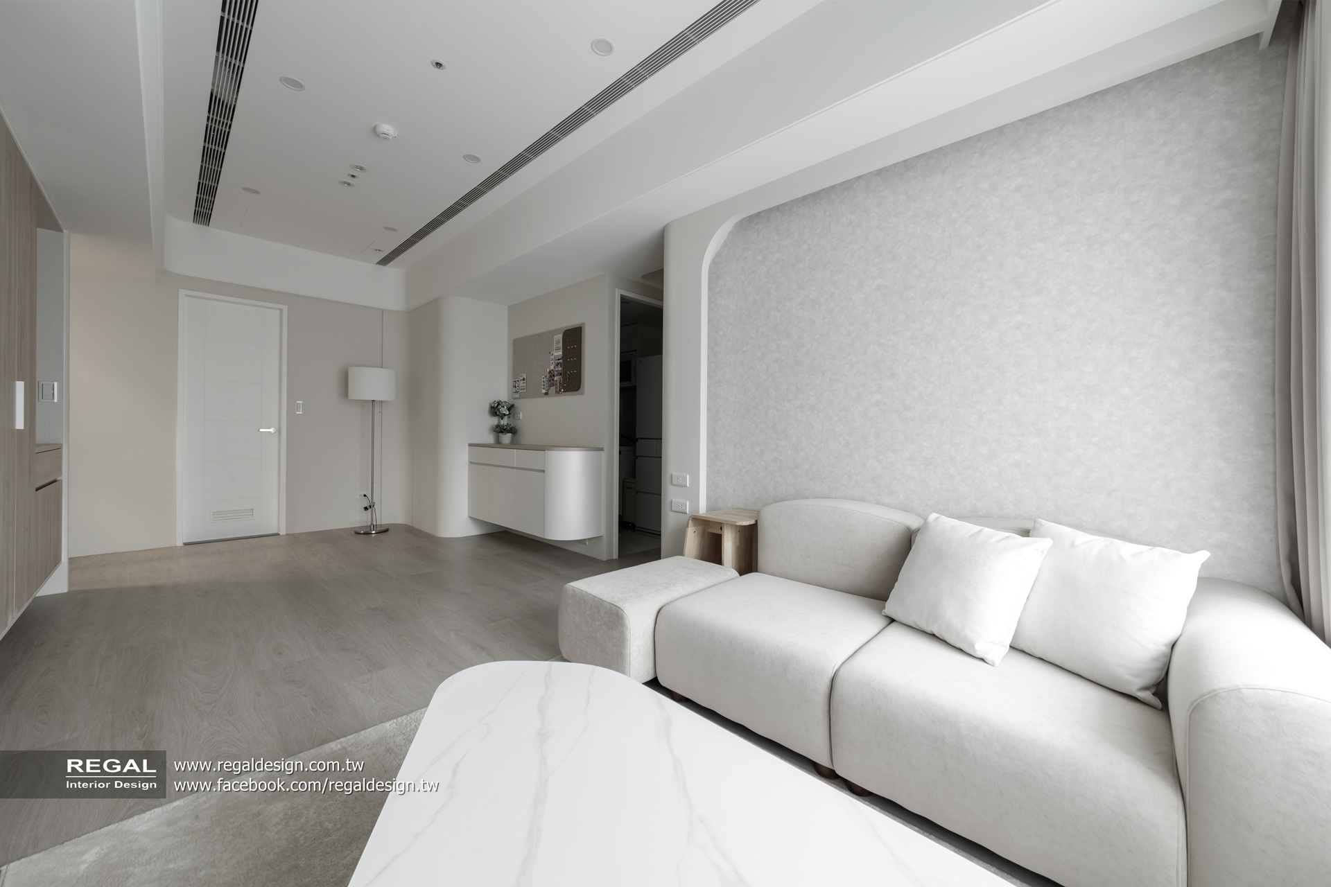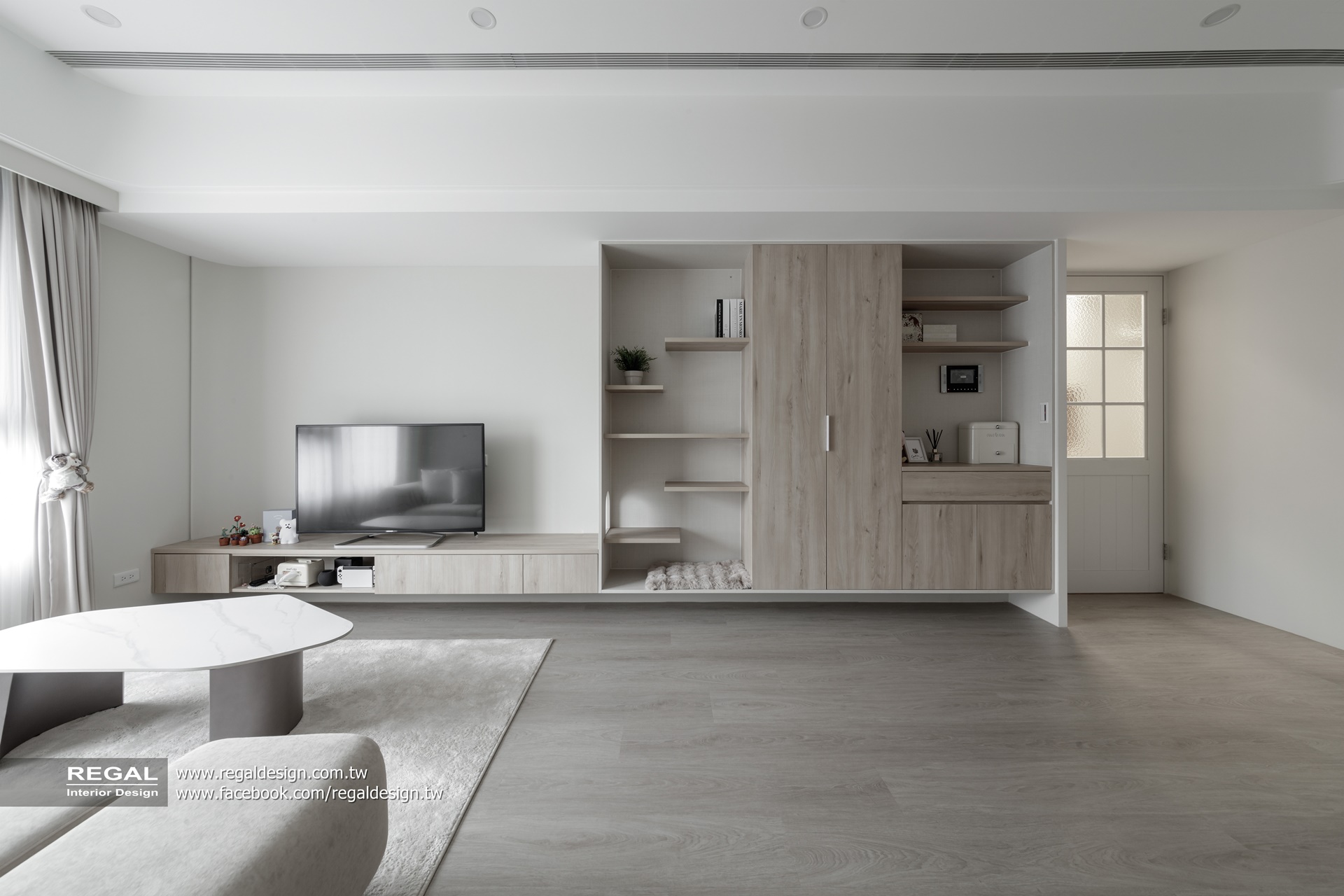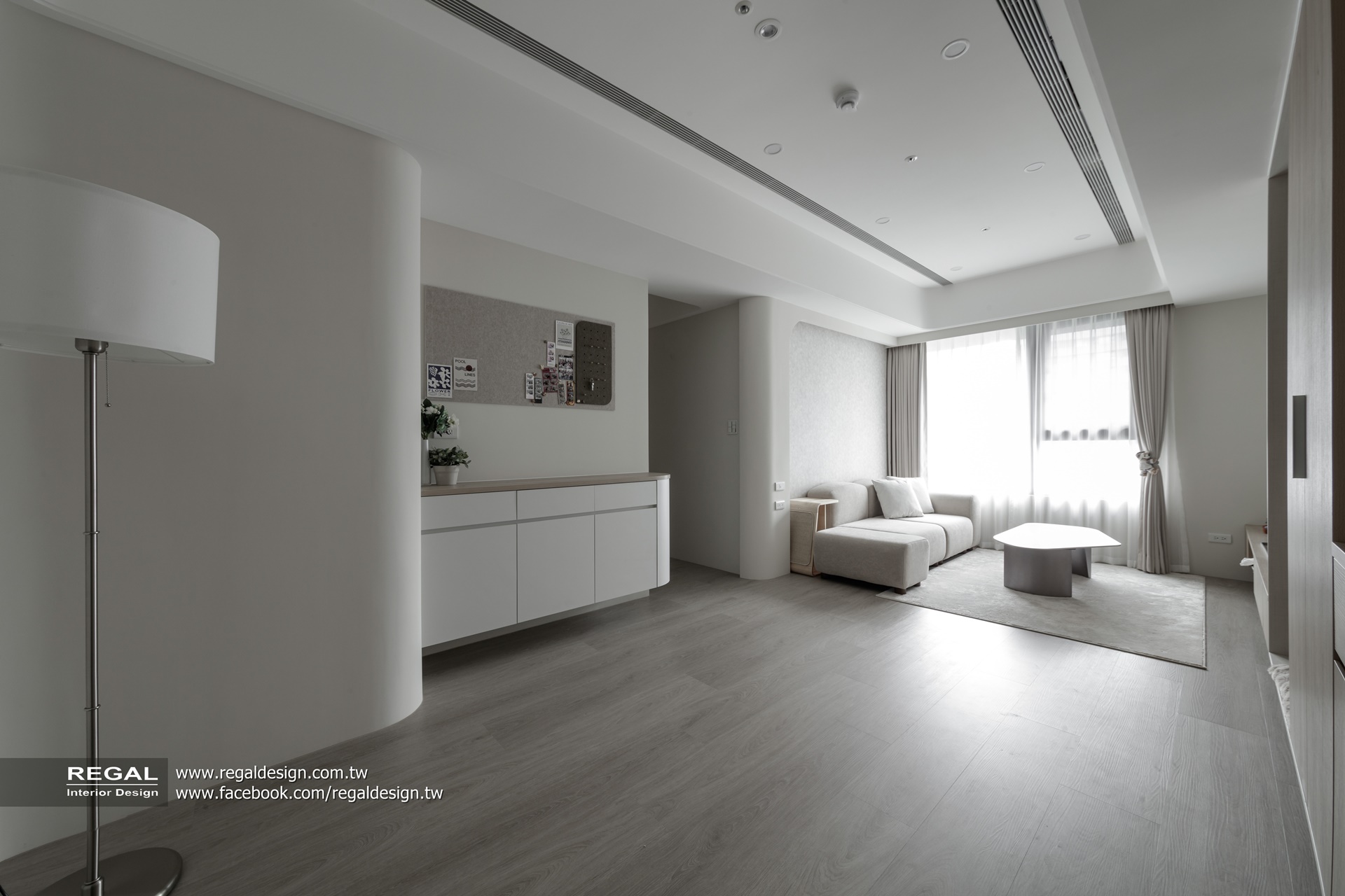 公領域以開放式佈局整合客廳與流線型的圓弧咖啡茶水區,將生活機能隱入美型牆景中。全室鋪設質感溫潤的超耐磨木地板,為家人與毛孩提供溫暖且耐用的活動地坪。