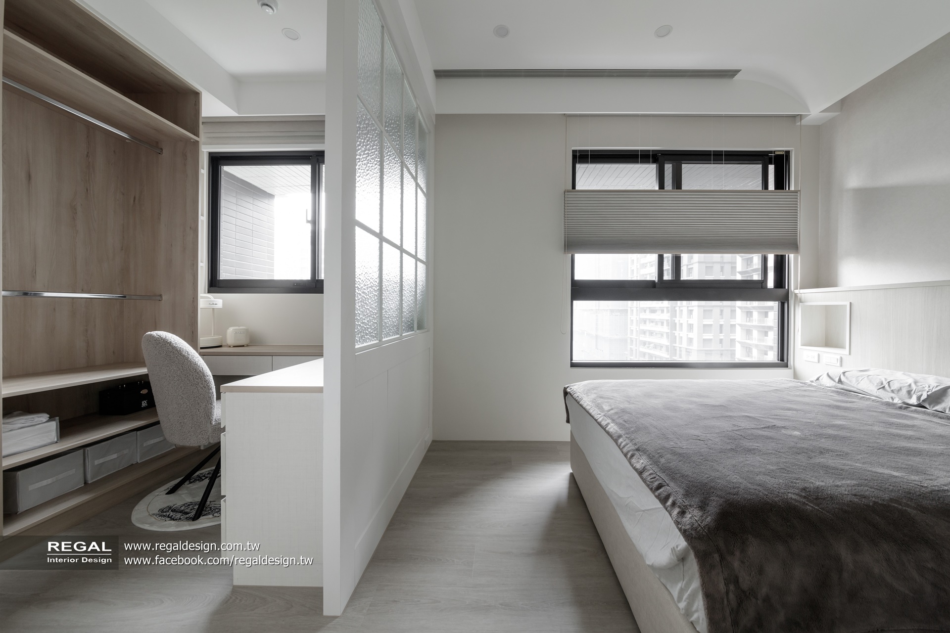 主臥室打破傳統牆面的束縛,改以半牆結合玻璃劃分出更衣化妝區,這種做法讓日光能穿透至室內深處。為了落實寵物友善設計,房門特別預留了專屬貓洞,讓毛孩能隨時自由穿梭。地坪同樣延伸超耐磨木地板的觸感,在圓弧造形設計的包覆下,讓臥室成為一處能徹底放鬆的安靜角落。