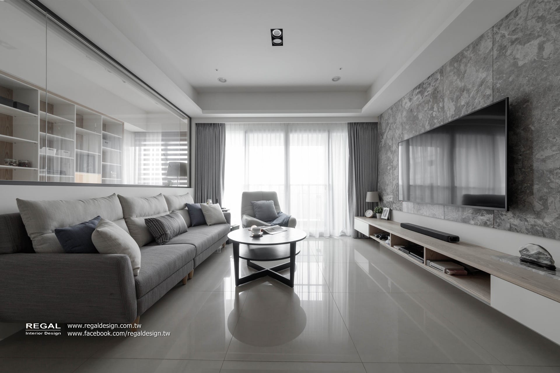 2.客廳視覺的主角:大理石電視牆,刻意採用隨興不規則切割手法,恰到好處的紋理拼貼,為冰冷的石材帶來同中求異的層次變化。