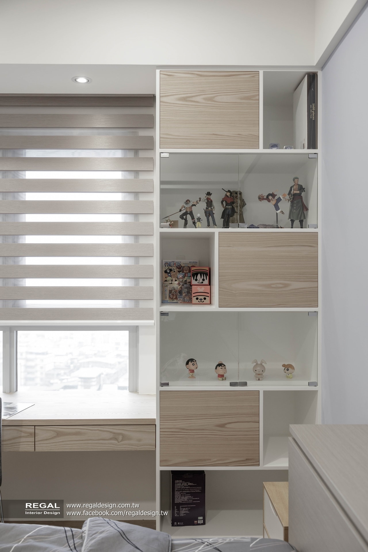 ▲半開放式的書櫃設計,兼具展示效果,並滿足學齡時期擺放書籍的需求。