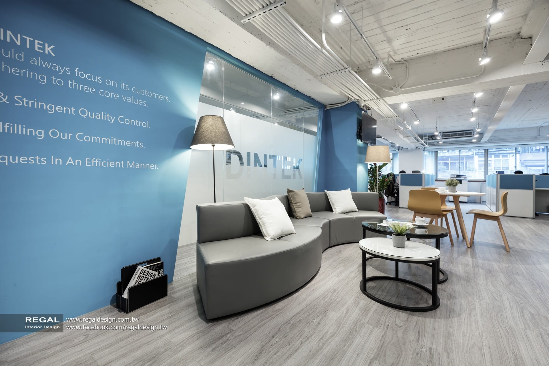 醒目的LOGO留白設計,透過企業色彩藍及燈光的配置,保留空間寬敞明亮,不僅符合企業精神,更為整體辦公空間注入滿溢活力。