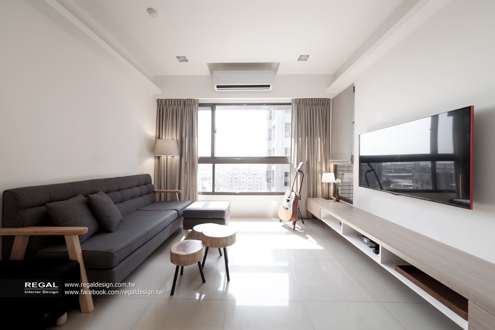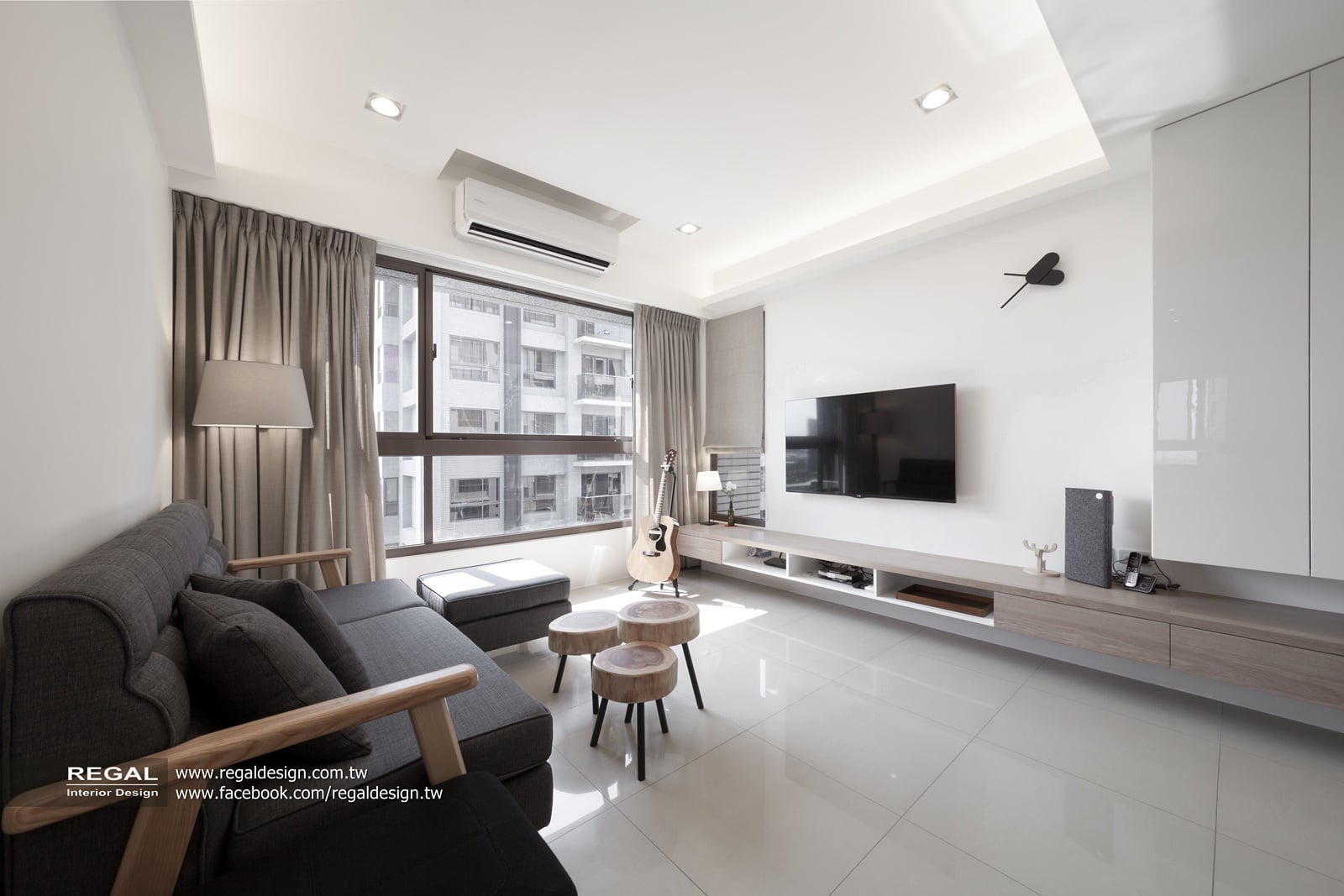 玄關與客廳電視牆的立面空間,採用連貫性的櫃體設計。縝密計算黃金比例將牆面劃分為鞋櫃、置物櫃、電視牆以及窗戶,掌握量大色輕、量小色重的原則,設計開放式深色格櫃銜接,絕佳的視覺分割平衡了客廳的配置與色彩。