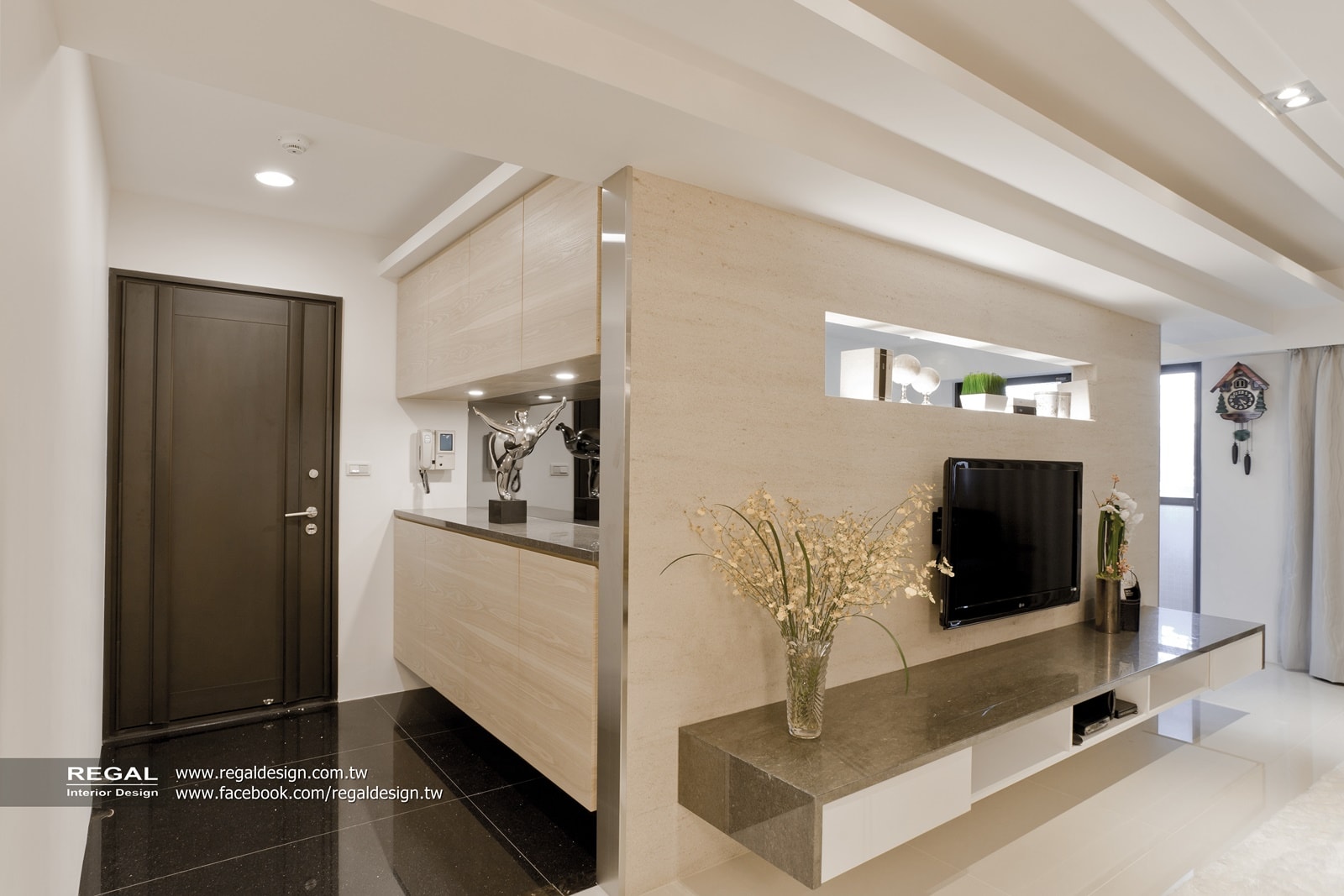 建材使用:天然大理石、毛絲面不銹鋼、灰鏡、拋光石英地磚、實木地板、天然實木皮