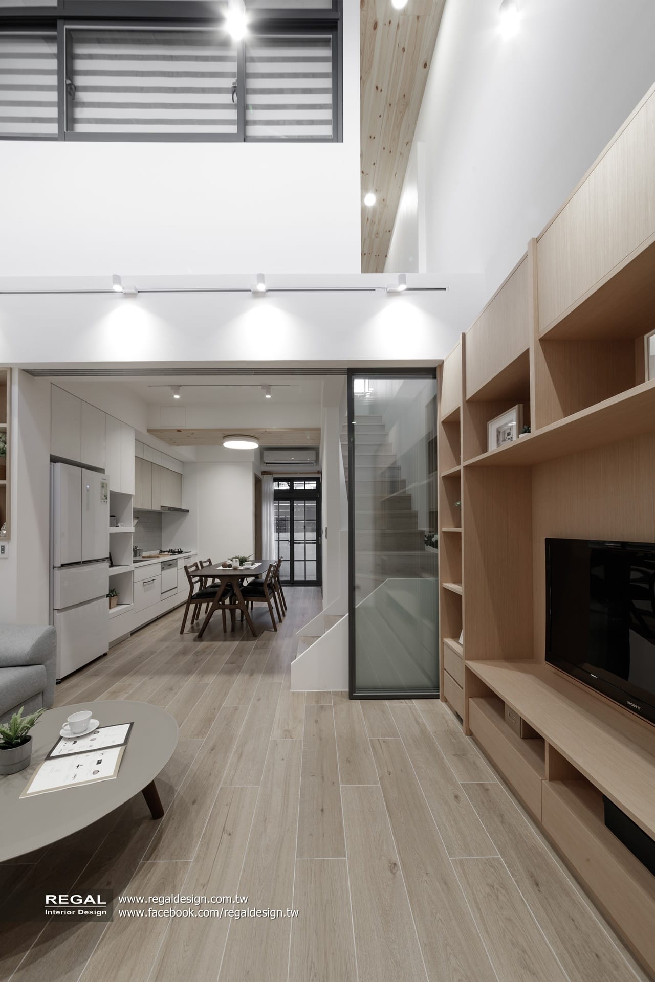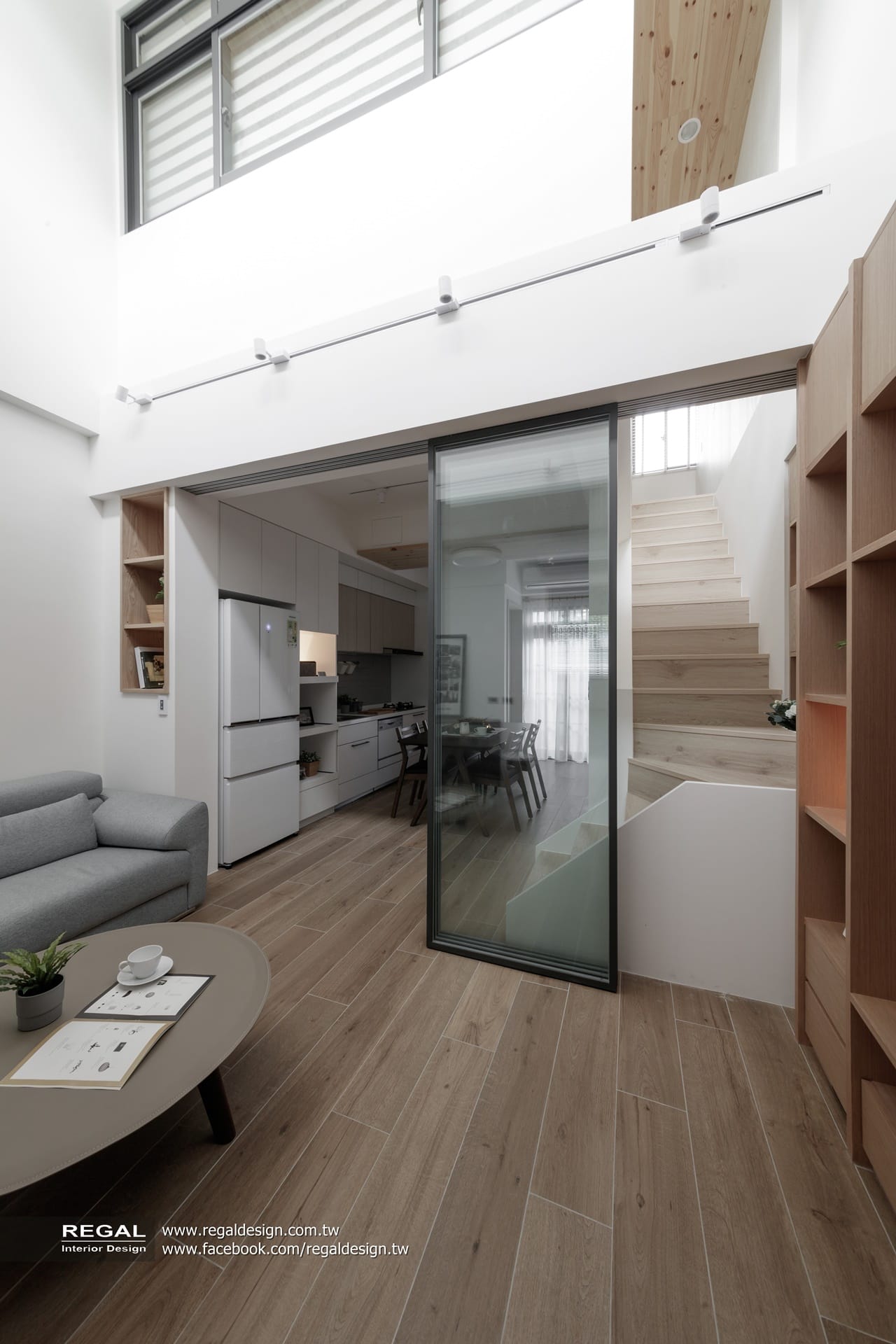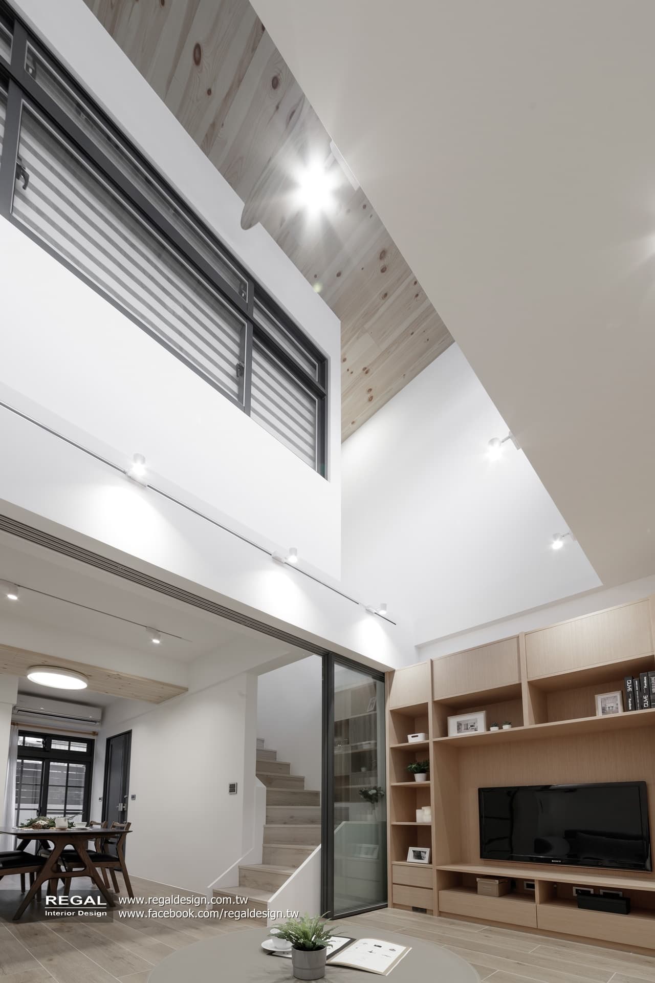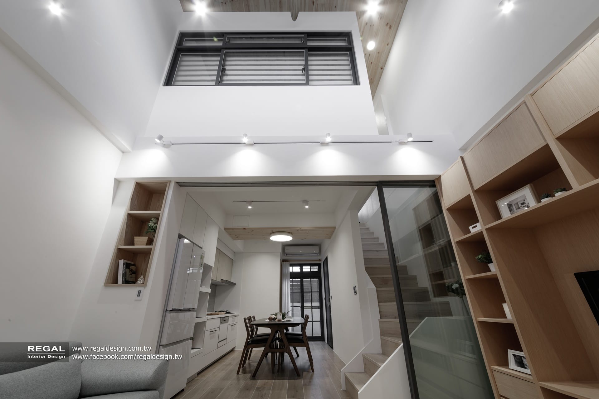 室內呈現清新的日式無印風,簡潔配色結合淺色系木紋,讓空間氛圍清爽舒適。保留原屋況挑空處,使空間得以吸收陽光,放大長形窄屋的空間感。