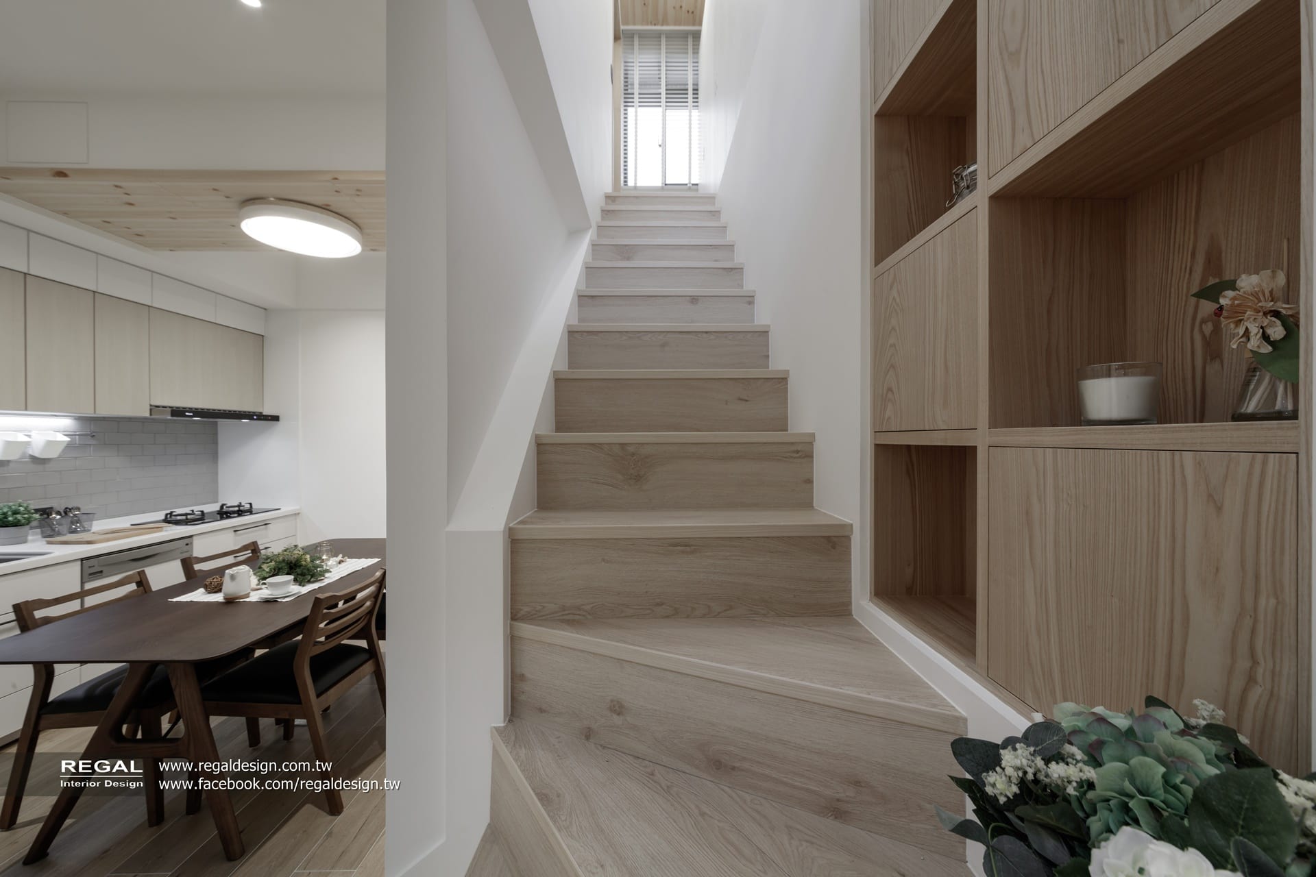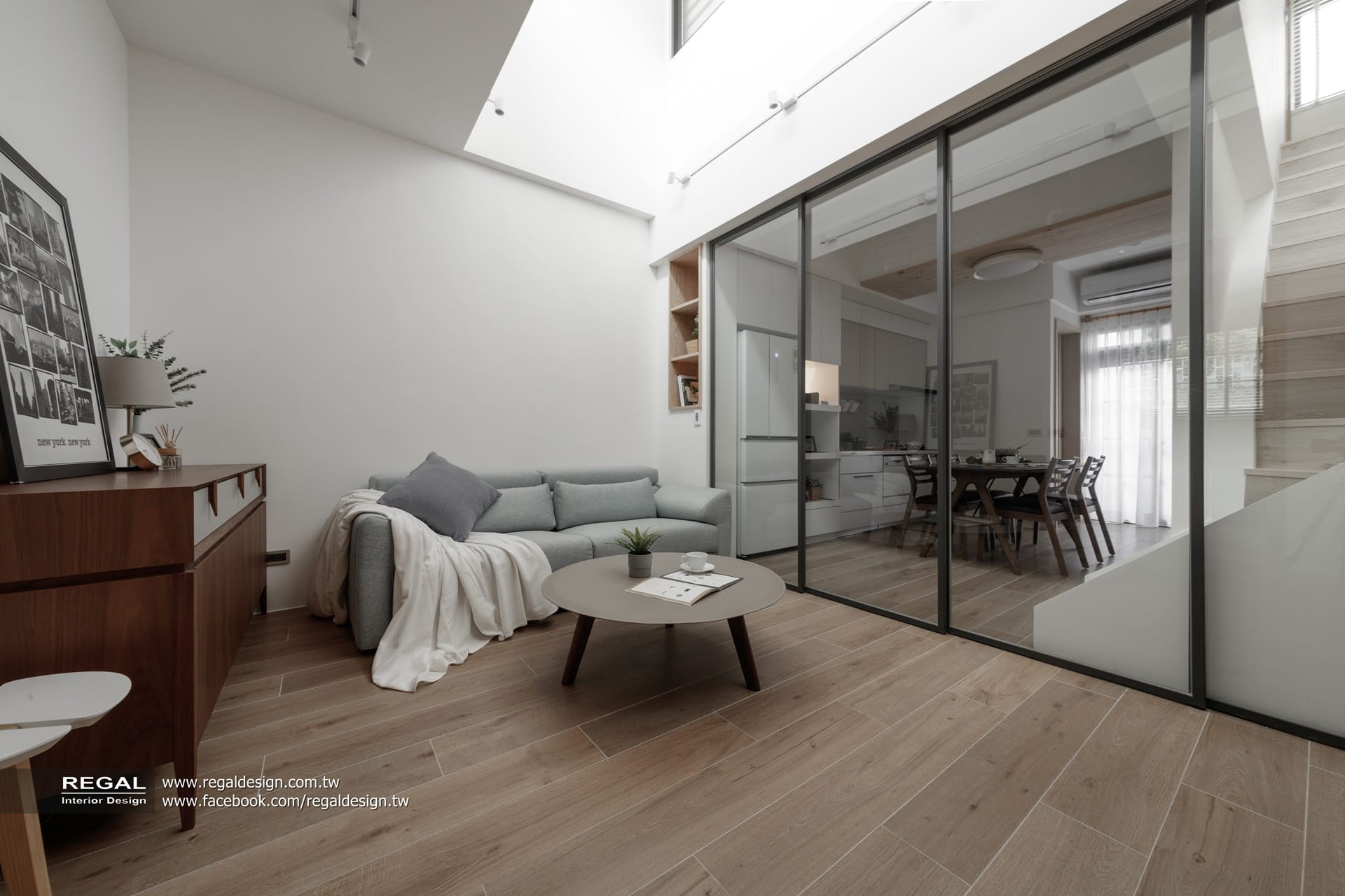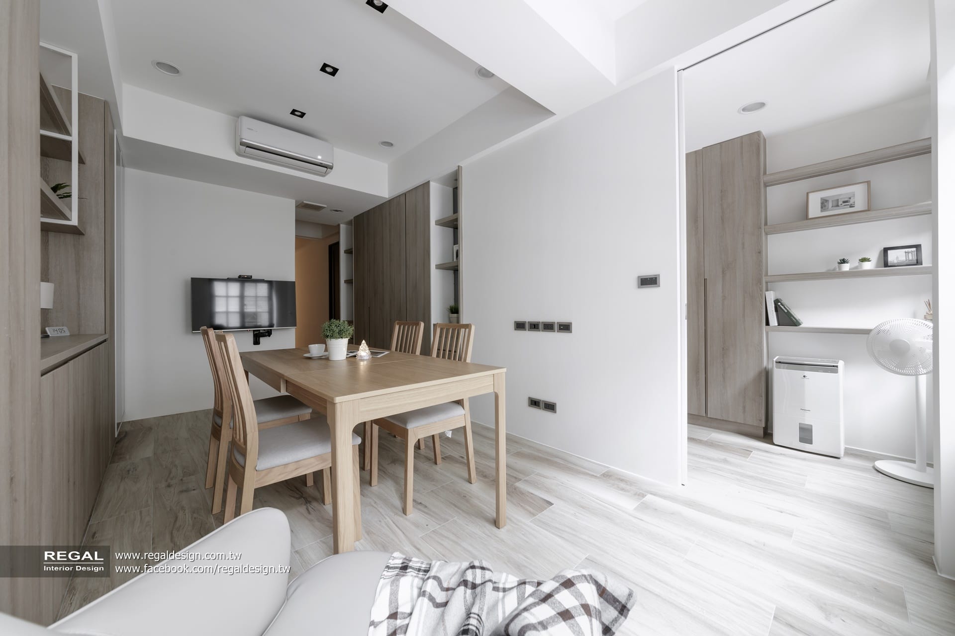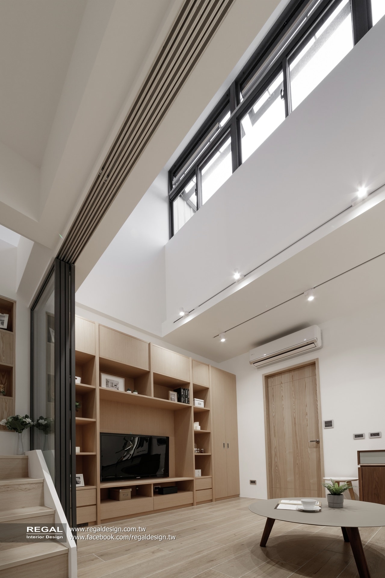 室內呈現清新的日式無印風,簡潔配色結合淺色系木紋,讓空間氛圍清爽舒適。保留原屋況挑空處,使空間得以吸收陽光,放大長形窄屋的空間感。