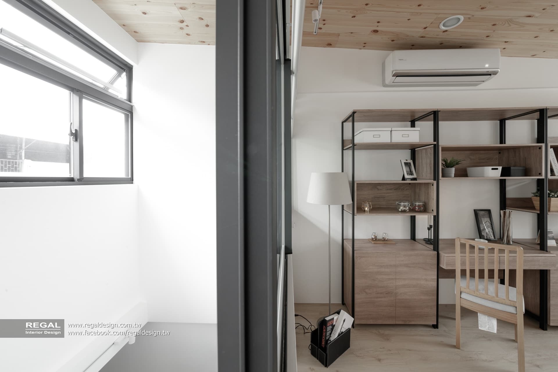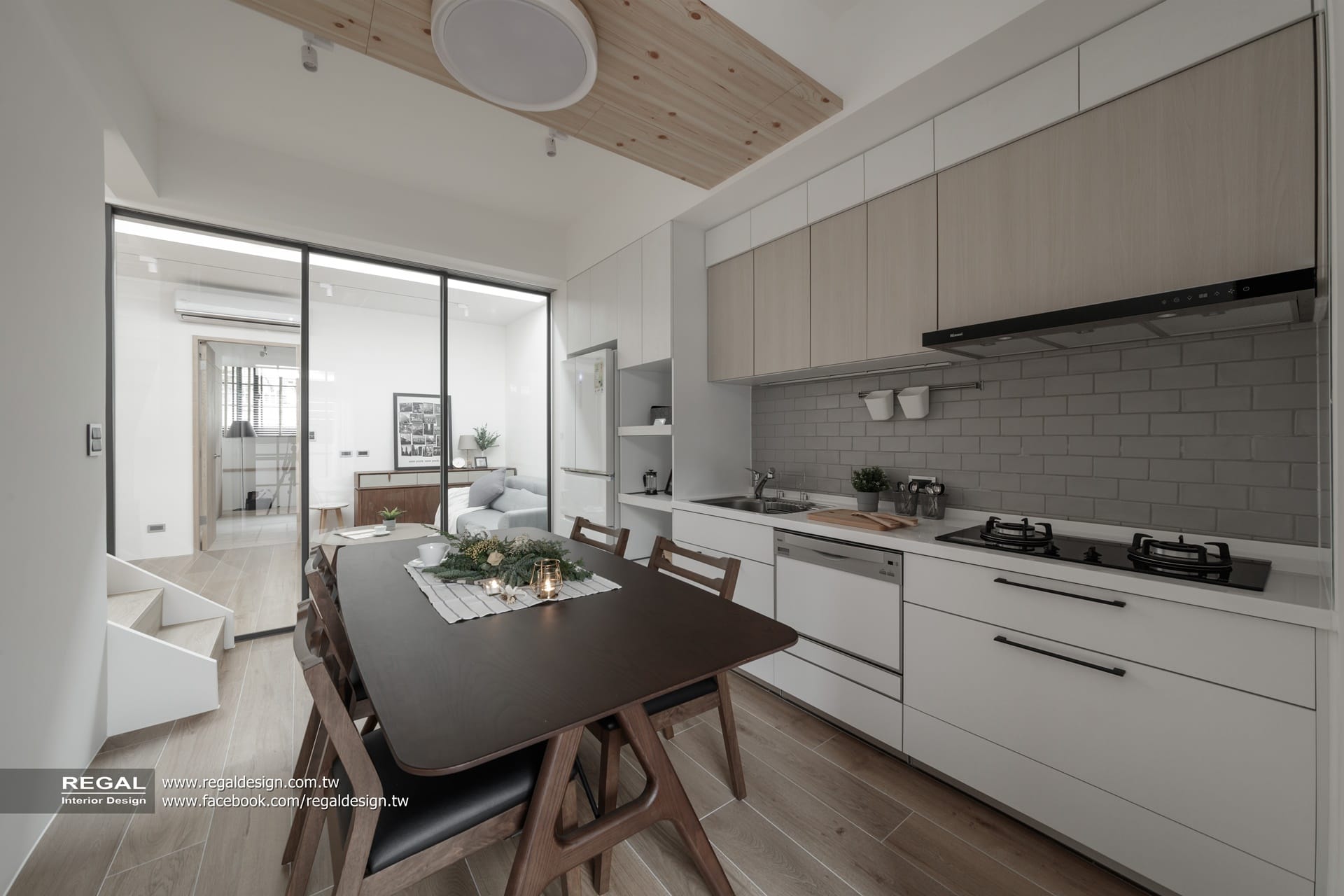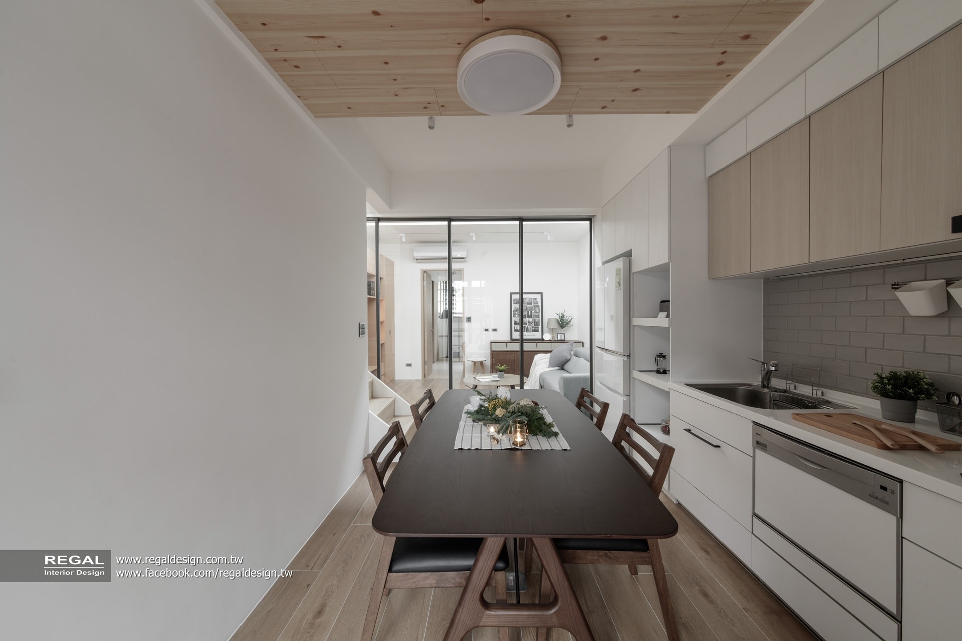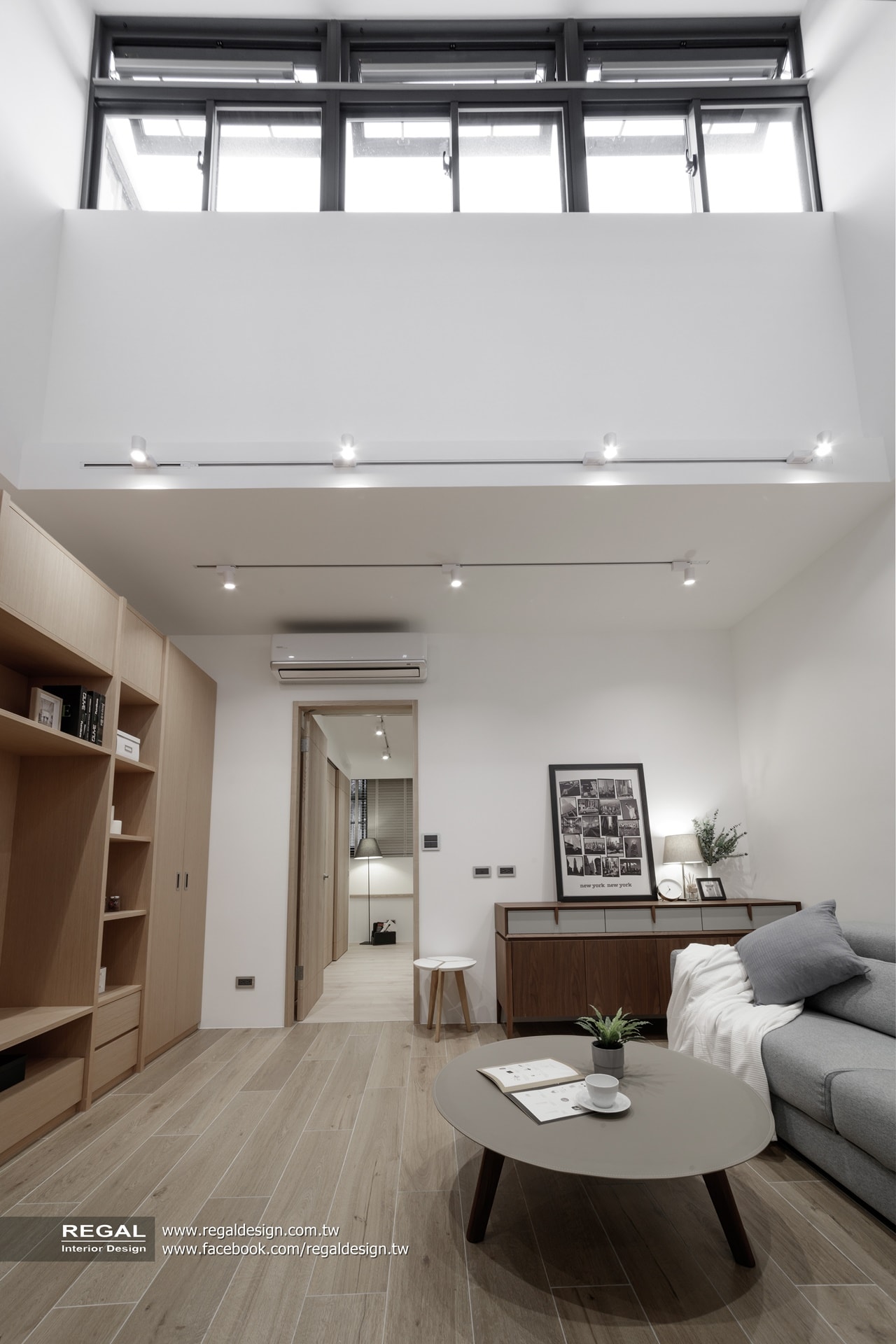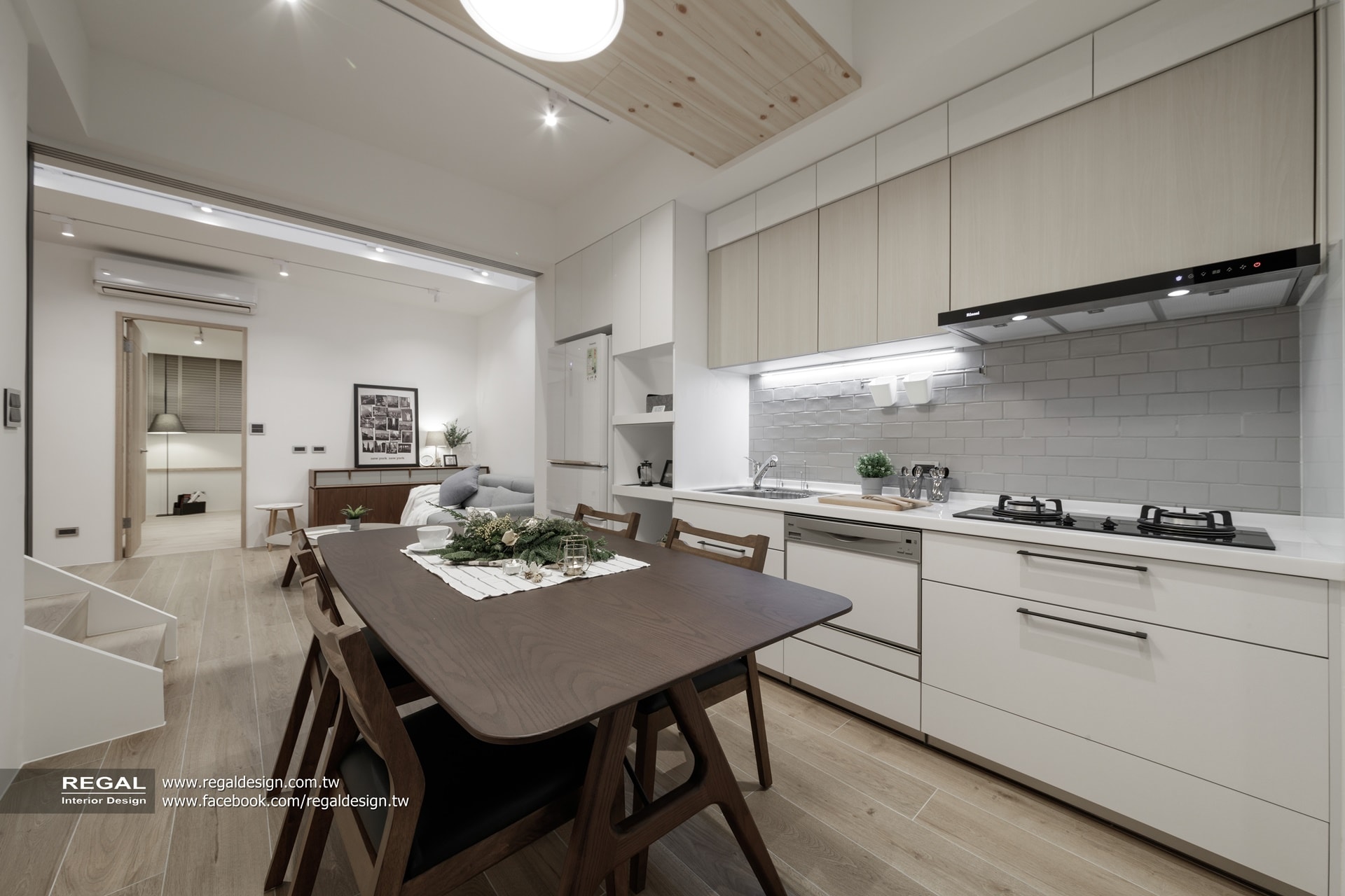 室內呈現清新的日式無印風,簡潔配色結合淺色系木紋,讓空間氛圍清爽舒適。保留原屋況挑空處,使空間得以吸收陽光,放大長形窄屋的空間感。