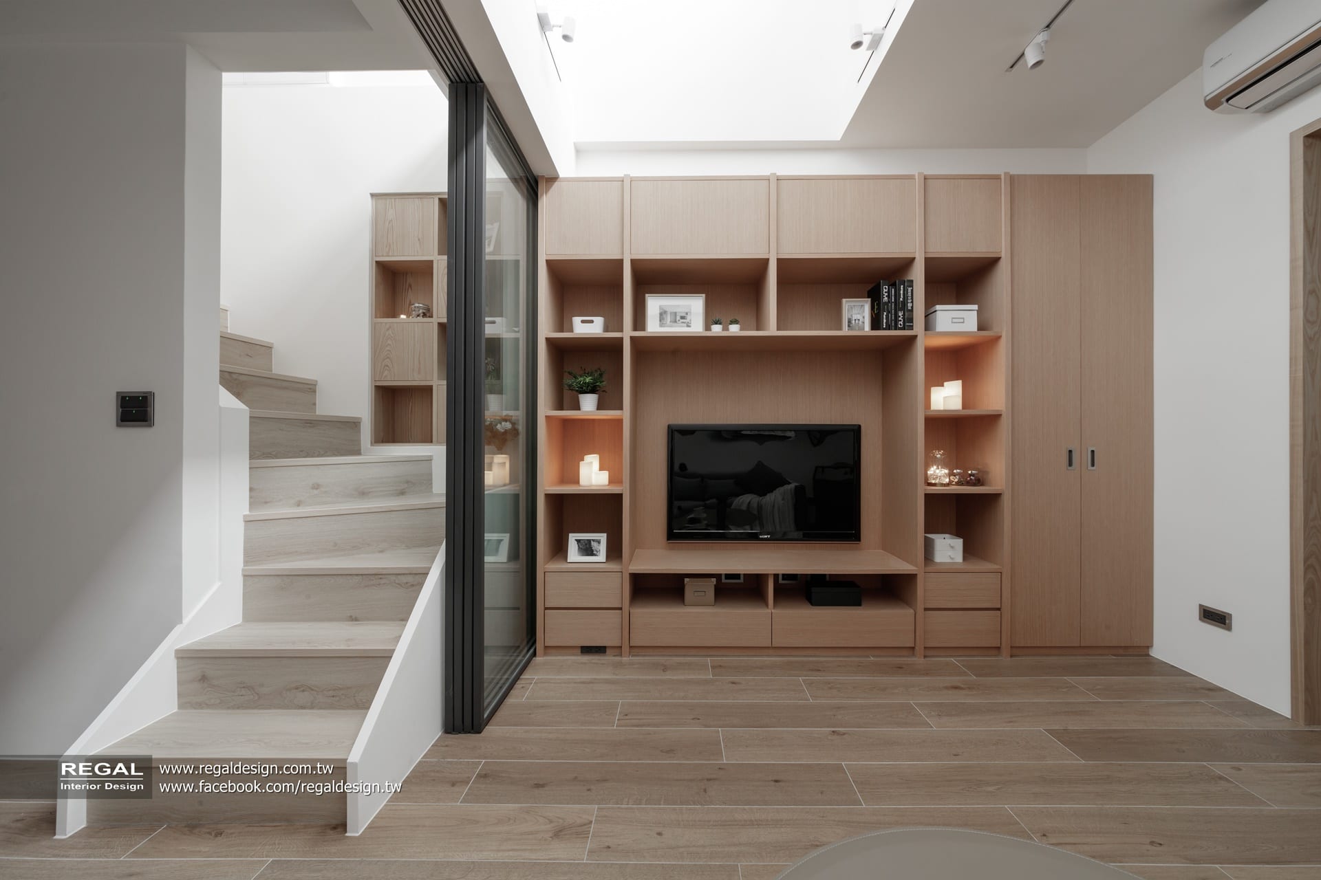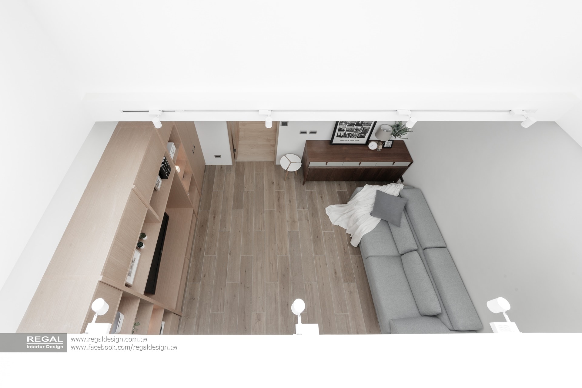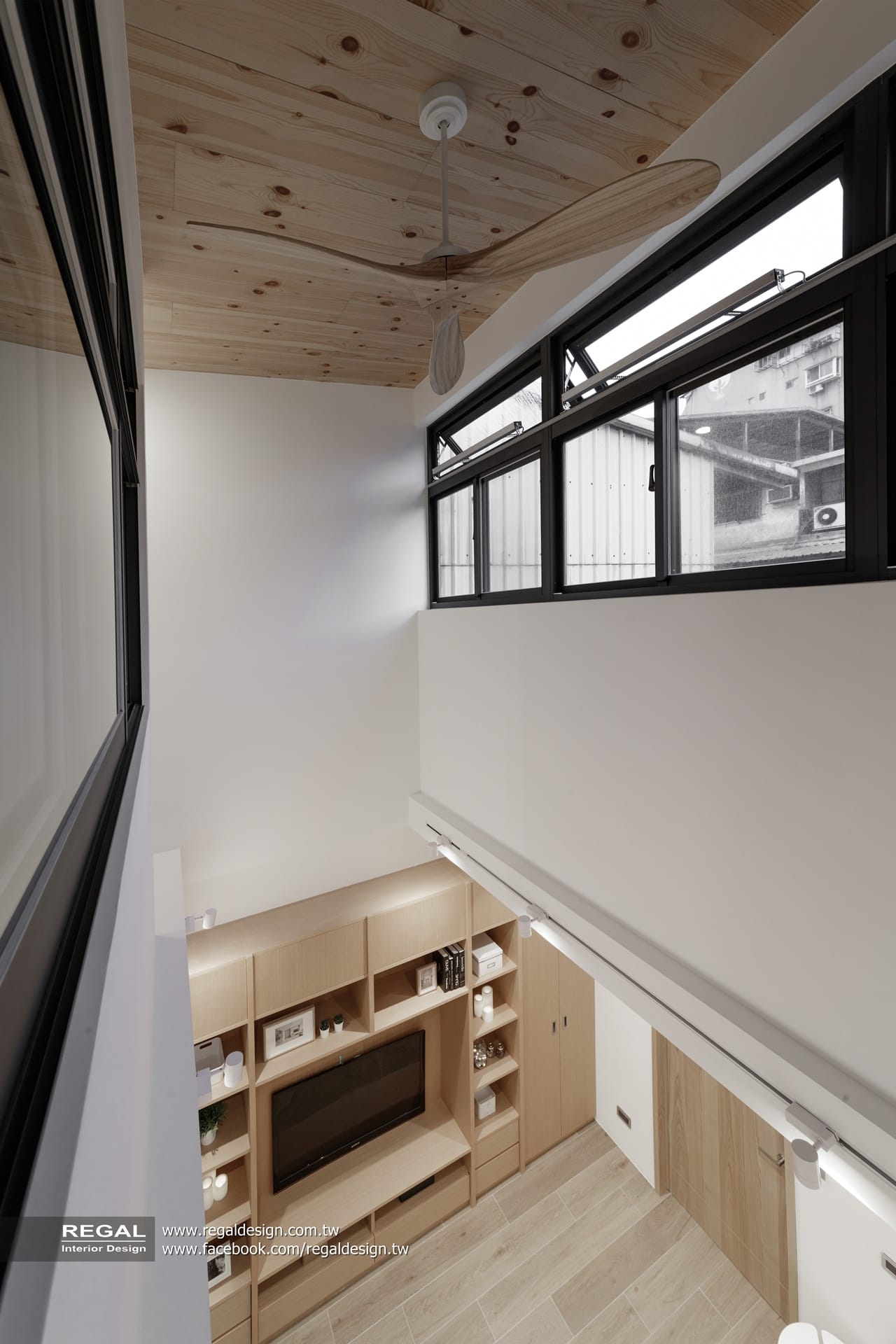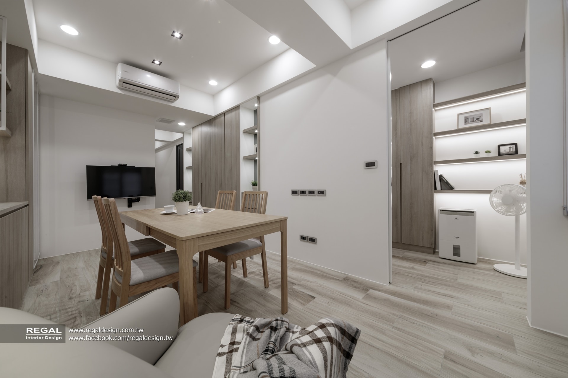 室內呈現清新的日式無印風,簡潔配色結合淺色系木紋,讓空間氛圍清爽舒適。保留原屋況挑空處,使空間得以吸收陽光,放大長形窄屋的空間感。
