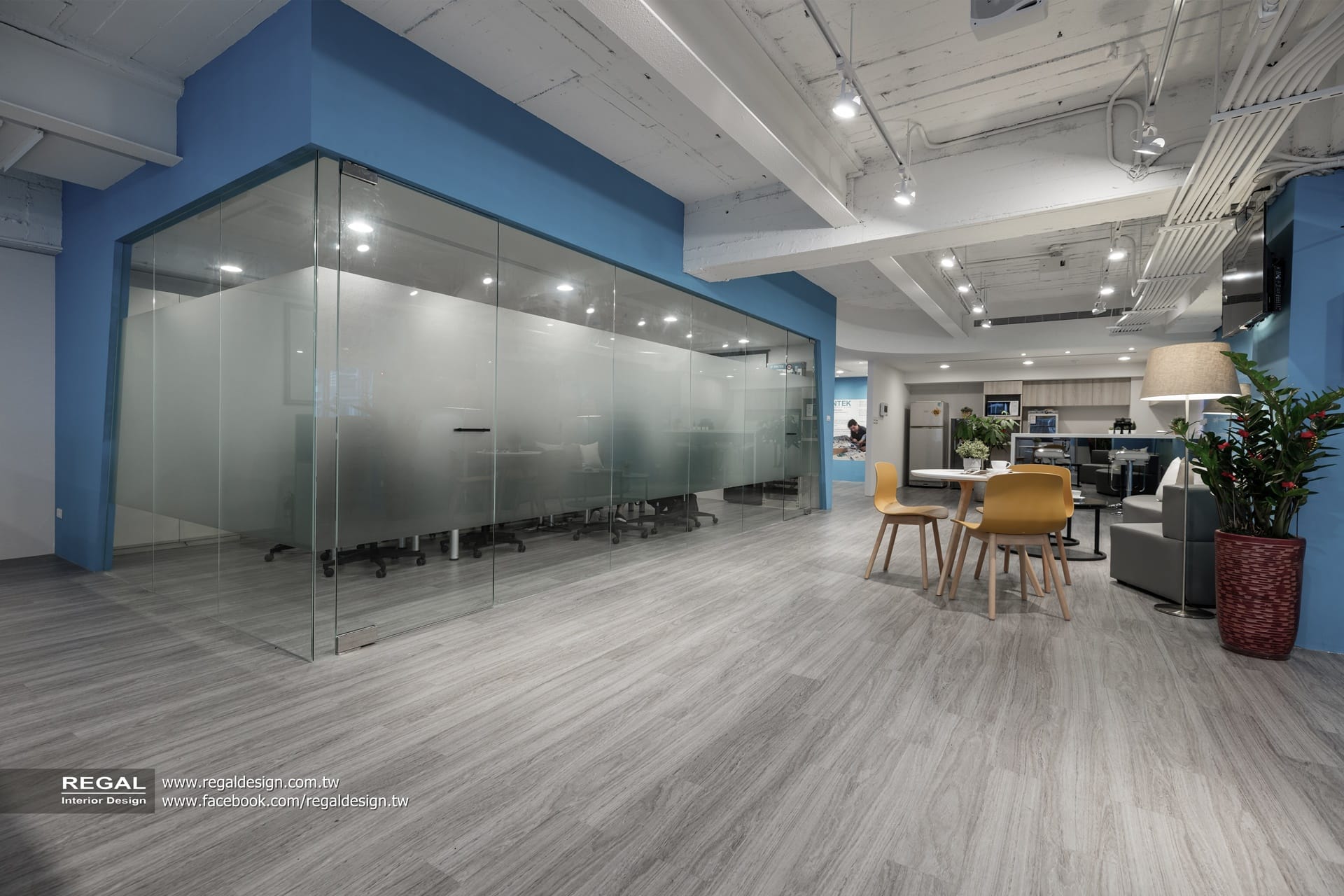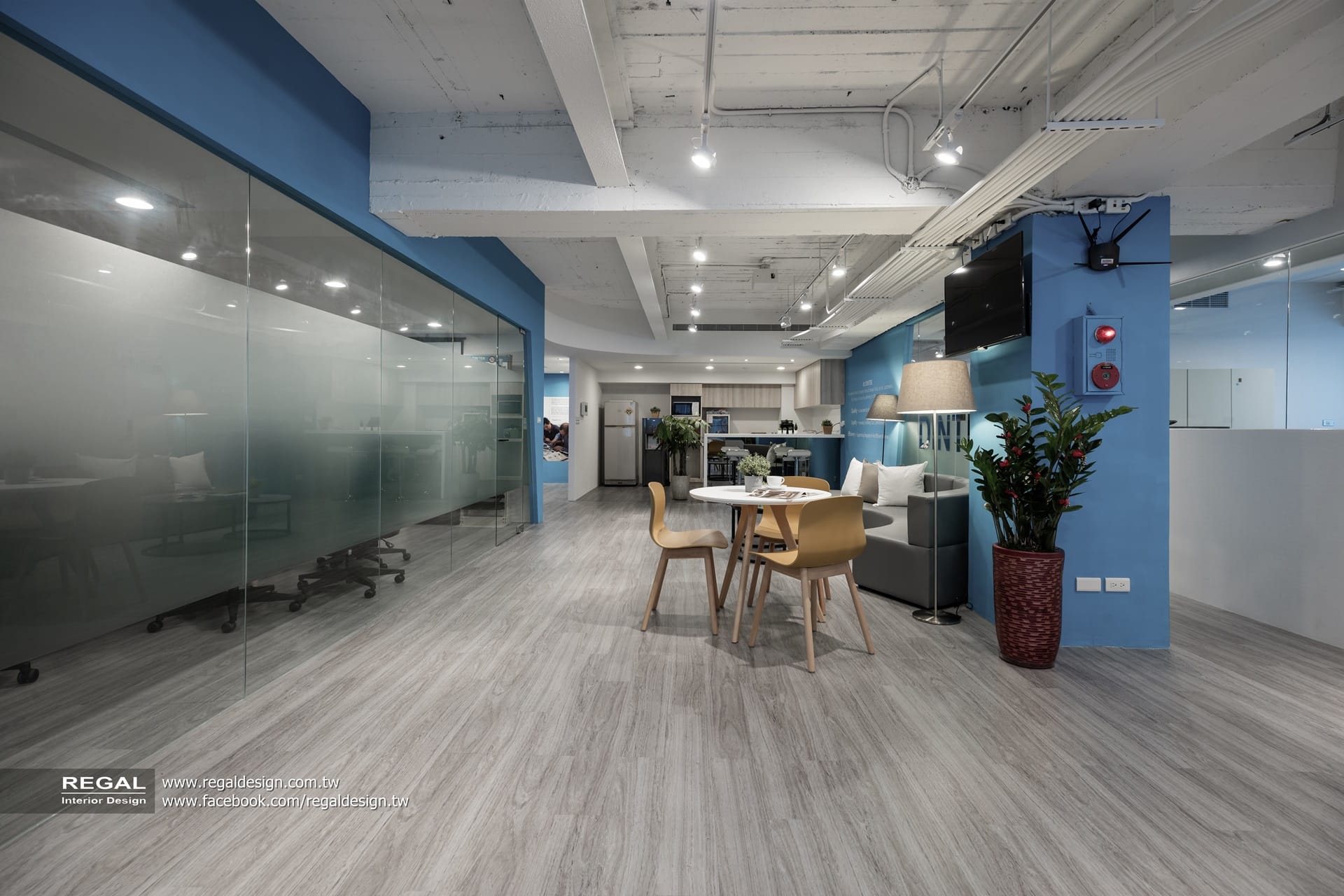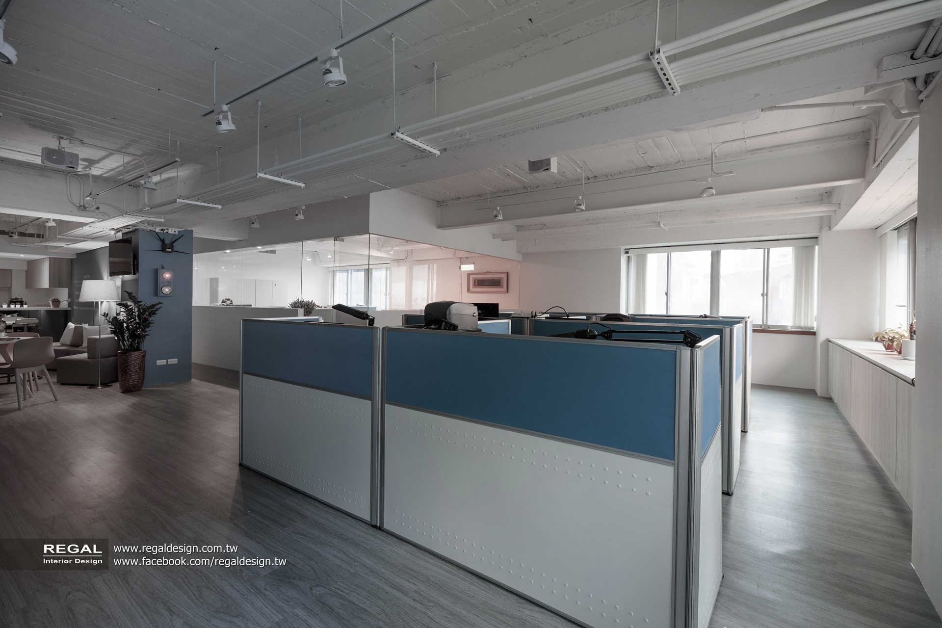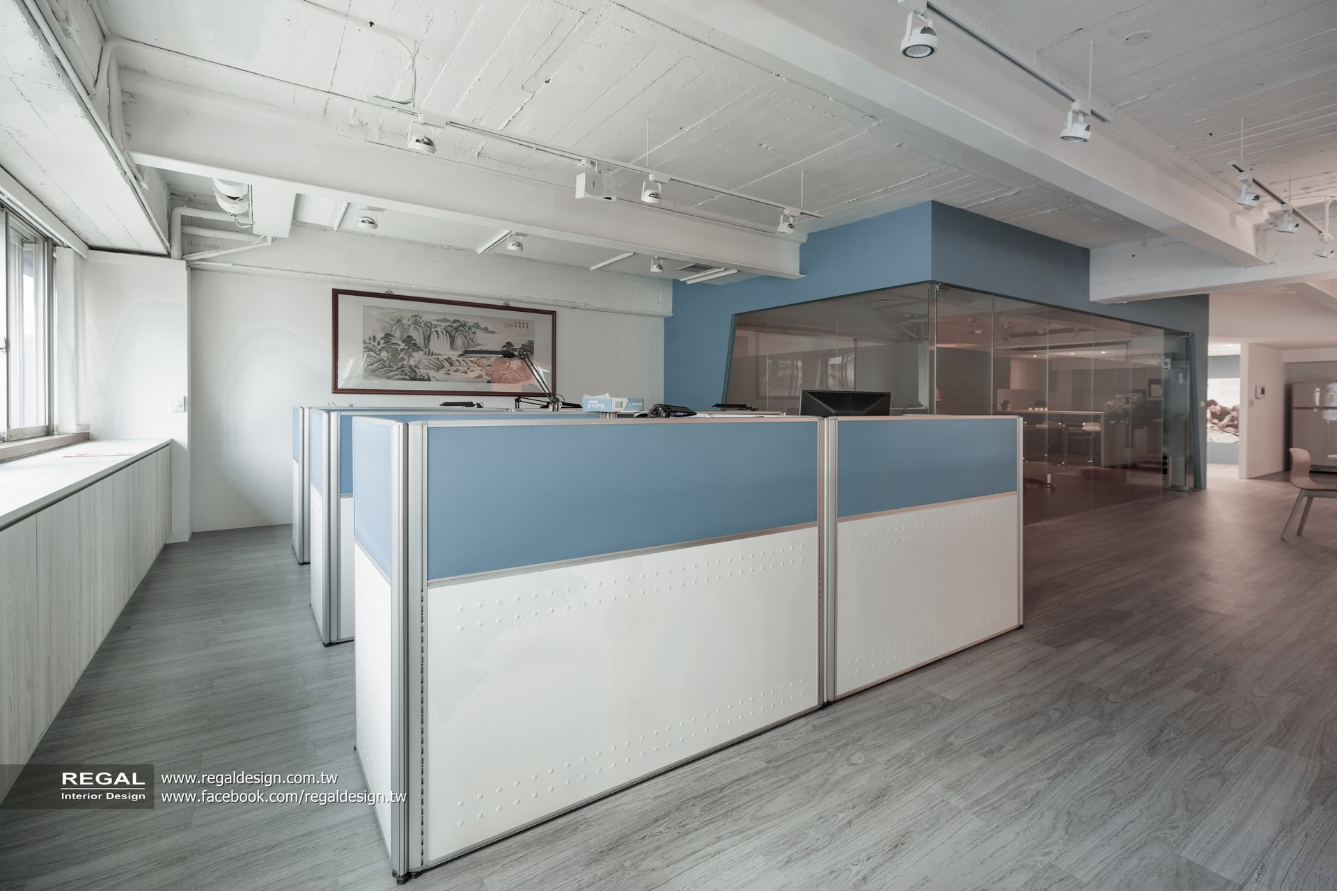 視覺上運用色塊及線條界定工作區域。利用淺色木紋及舒適的藍白色調作為基底,營造了休閒放鬆的工作氛圍。空間上則搭配具有穿透性的玻璃材質為區隔,增加通透感並保有適當的隱私性。