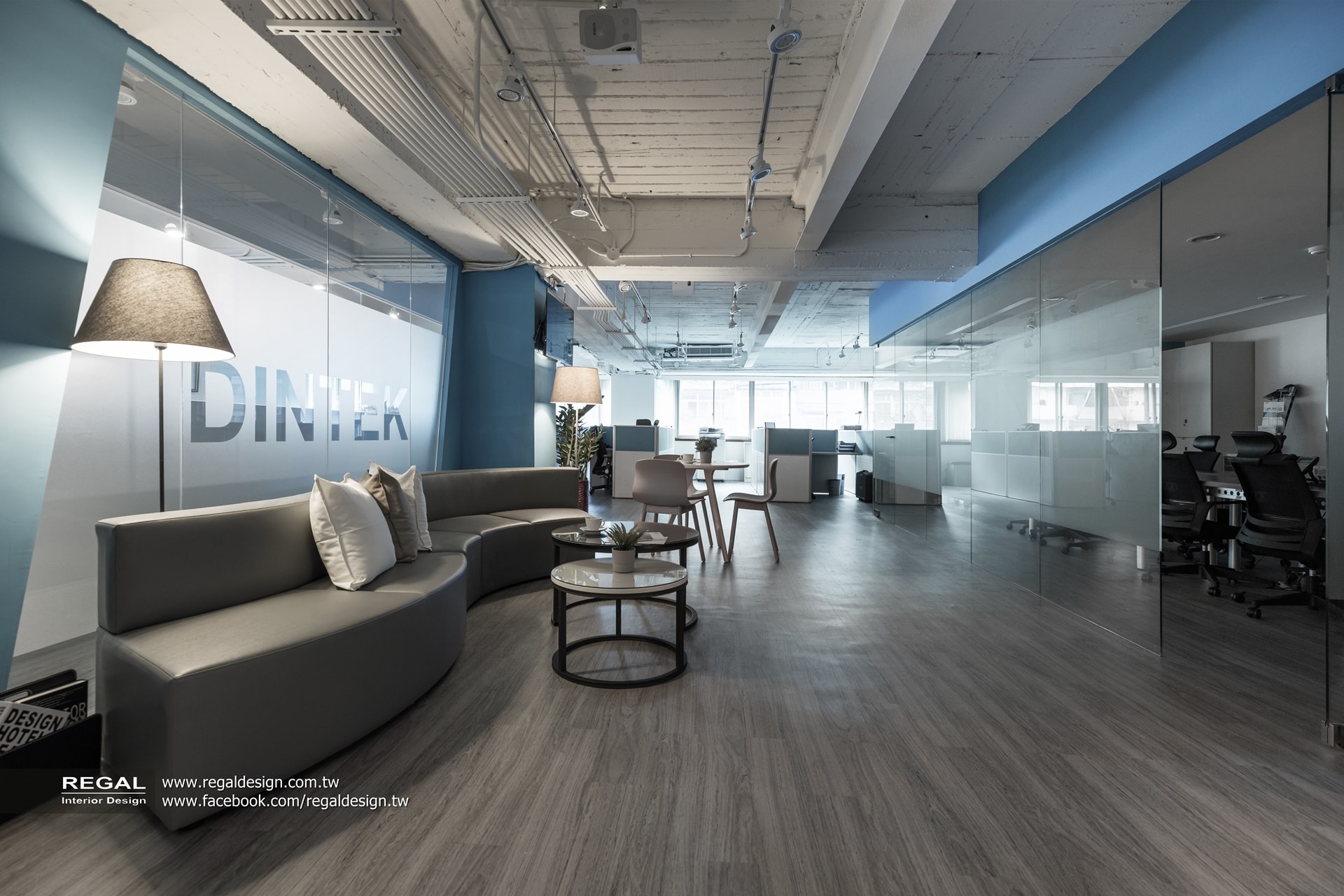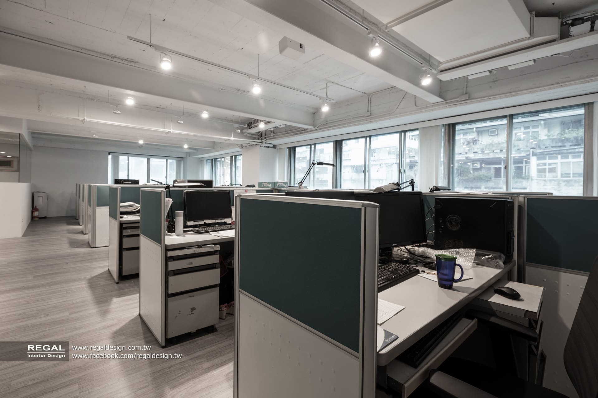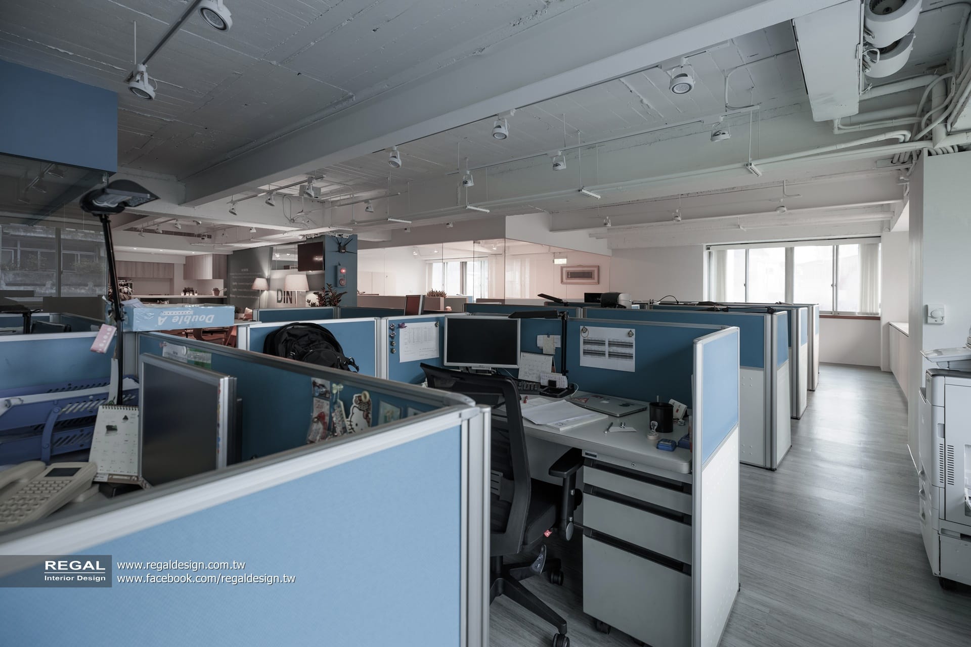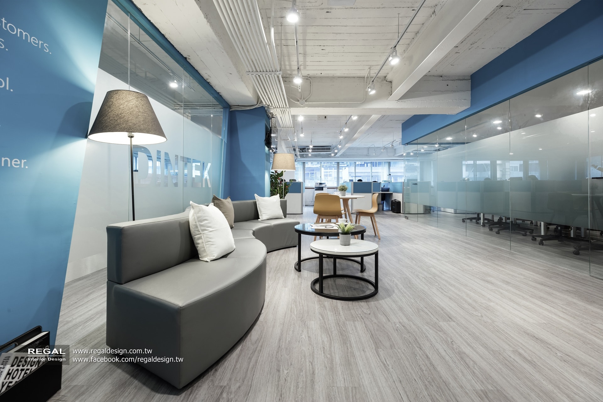 視覺上運用色塊及線條界定工作區域。利用淺色木紋及舒適的藍白色調作為基底,營造了休閒放鬆的工作氛圍。空間上則搭配具有穿透性的玻璃材質為區隔,增加通透感並保有適當的隱私性。